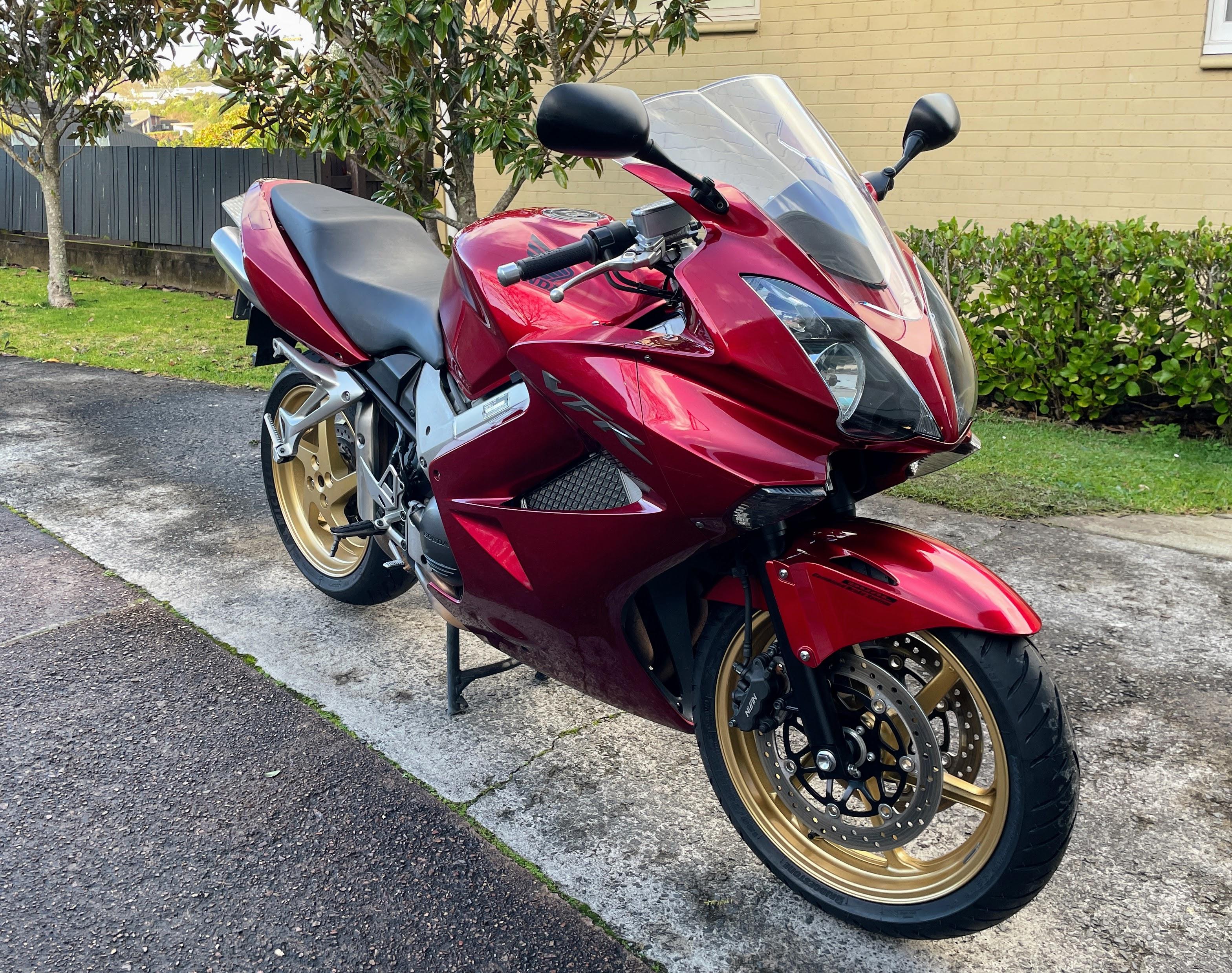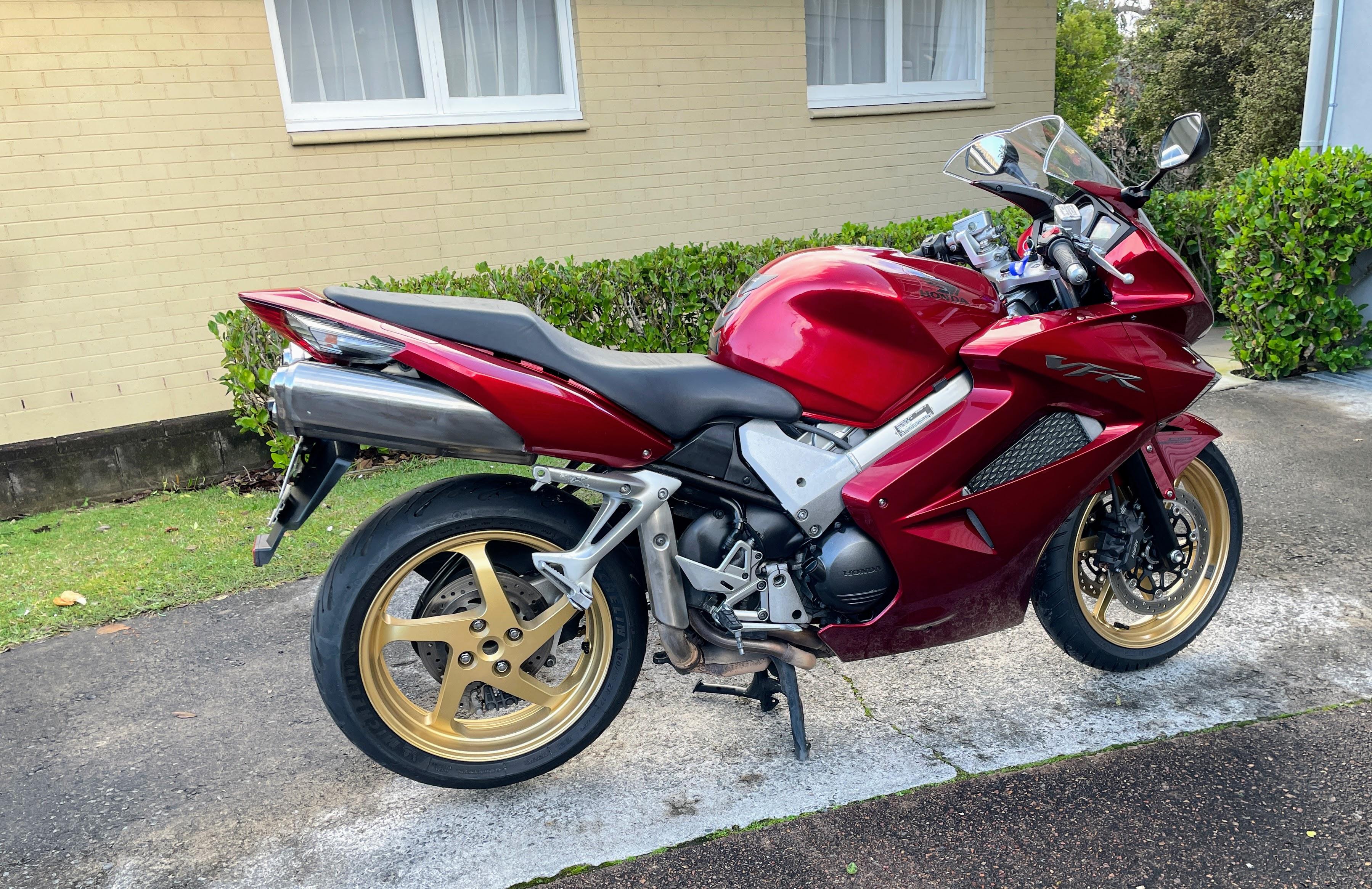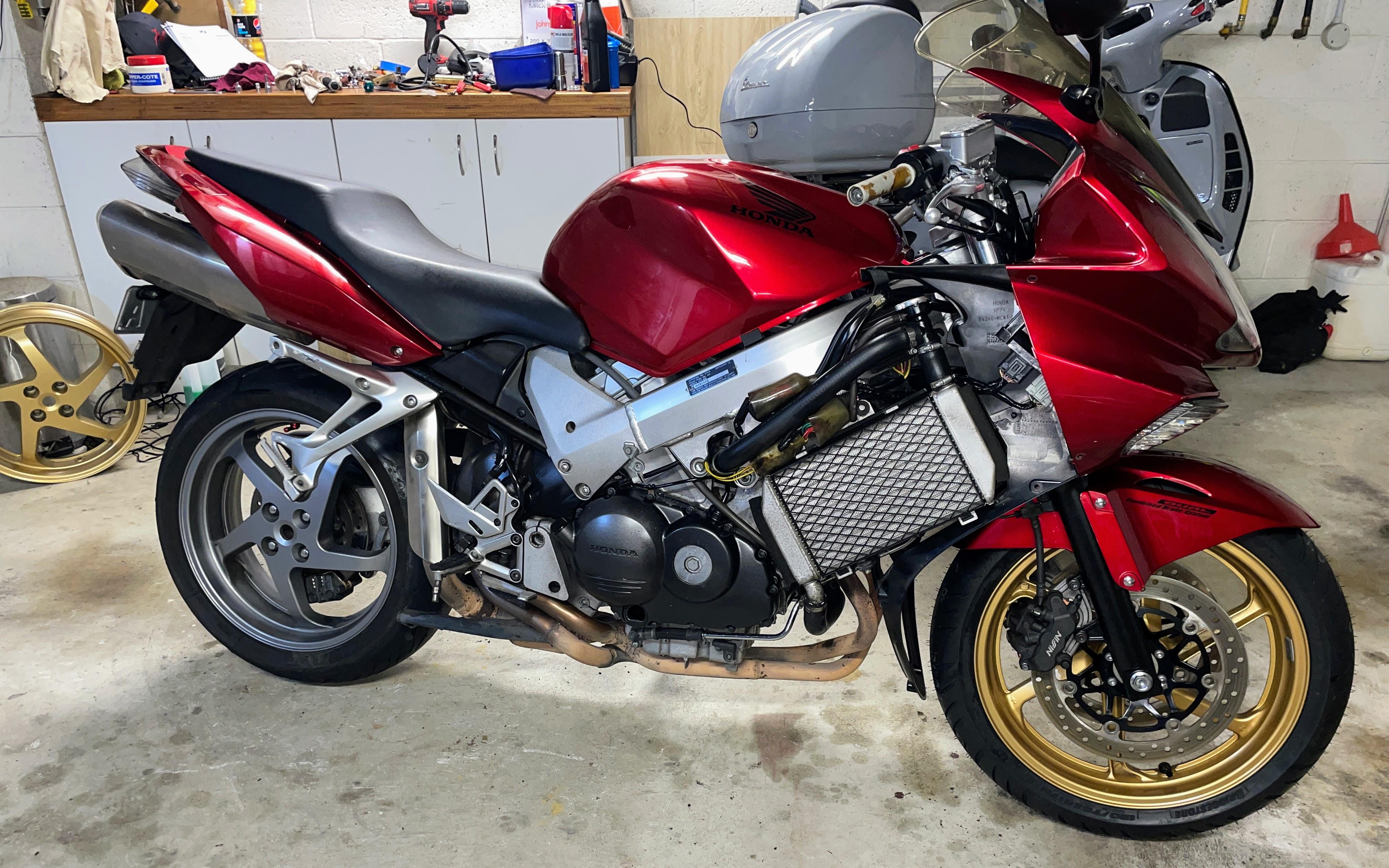 Member Contributer Popular Post Terry Posted July 12, 2024 Member Contributer Popular Post Posted July 12, 2024 I have been a confirmed fifth gen owner for many years, but recently a 2009 which had sat on the local auction site reached my "buy now" level. The bike has 85000km, and the PO had parked it in 2022 after an inspection failure due to thin front discs. I just so happen to have a complete set of near-new lovely gold wheels with discs that I bought speculatively 5 years ago. The bike also has the dreaded cam chain rattle at low revs, a cracked windscreen, leaking fork seals and very minor stationery drop damage, but the seller put zero effort into resolving any of those or even cleaning the bike for photos (or possibly at all, during his ownership...). His loss, my gain! I collected the bike last night and survived a chilly ride home which did not reveal any unexpected faults aside from weird handling due to low tyre pressures. I'm looking forward to peeling off the covers and giving this dirty bike a good scrubbing, and then setting to rectifying the faults. I am planning on trying the "two turns of extra spring preload" fix for the CCT but replacements don't look too expensive. I will also check out the valve clearances; as I don't want to buy the small dowels to lock the VTEC valves, can someone tell me what diameter rod I need to get to make my own? And no new post is complete without a photo... 12 Quote