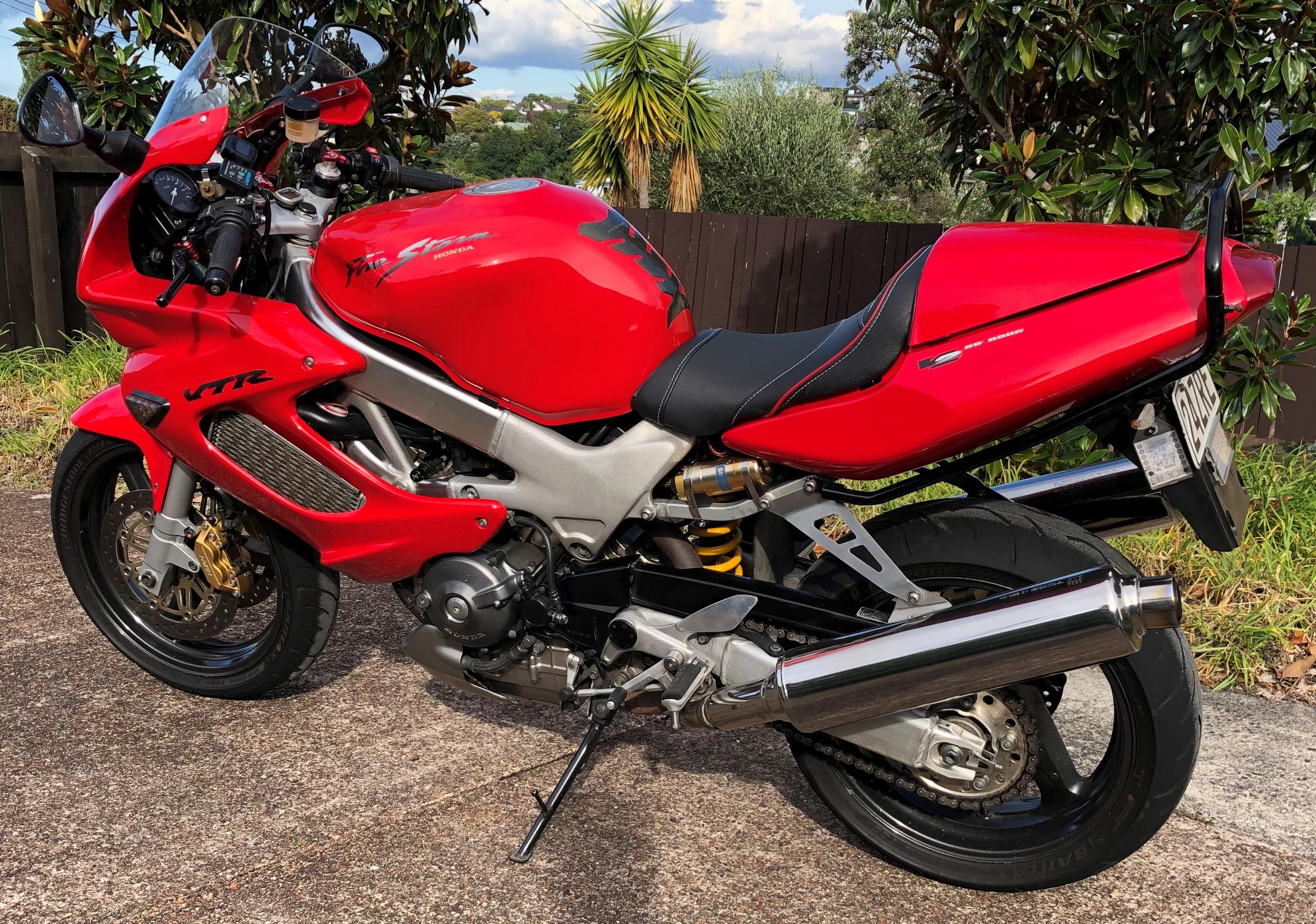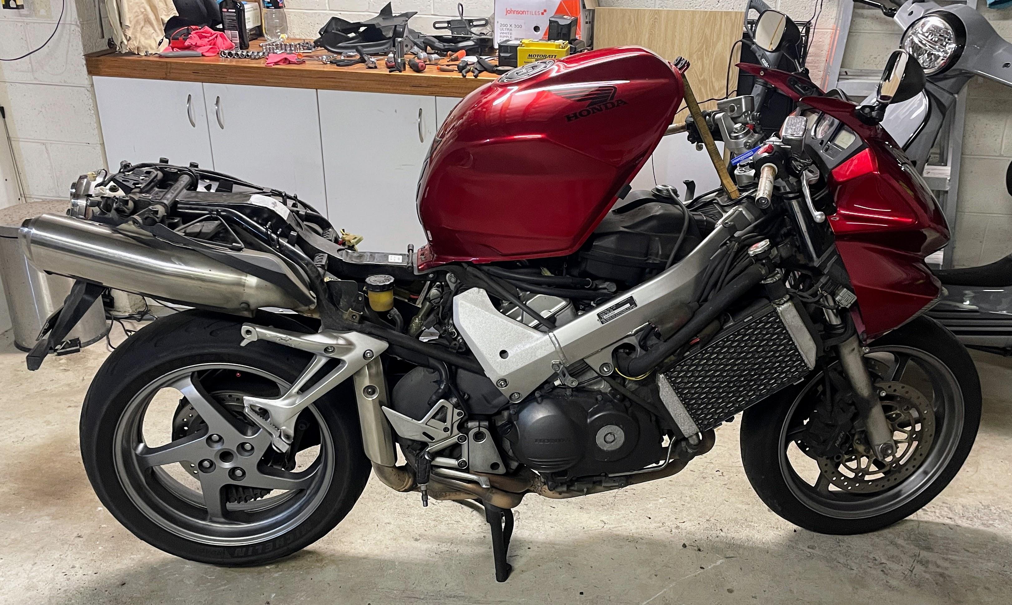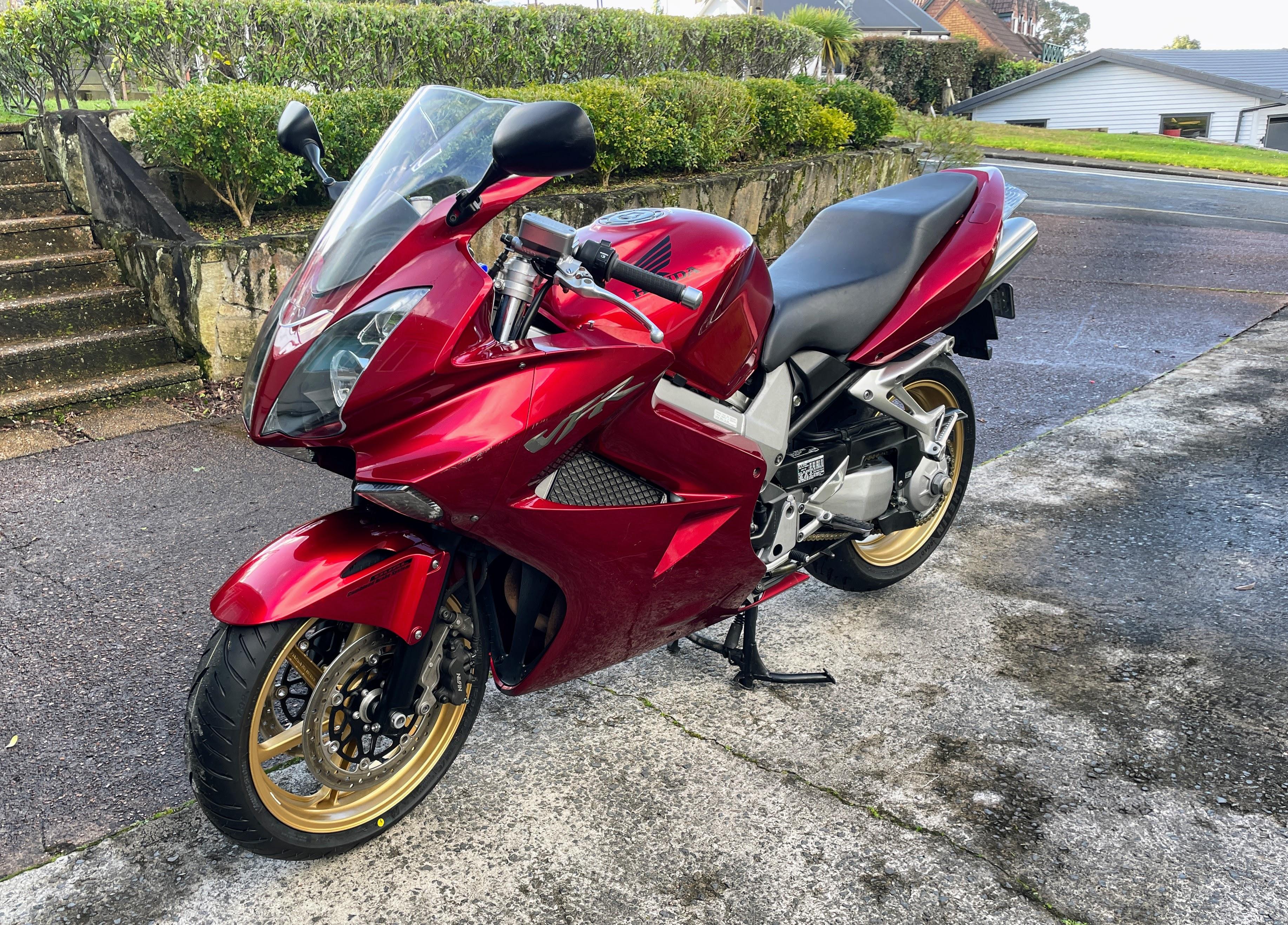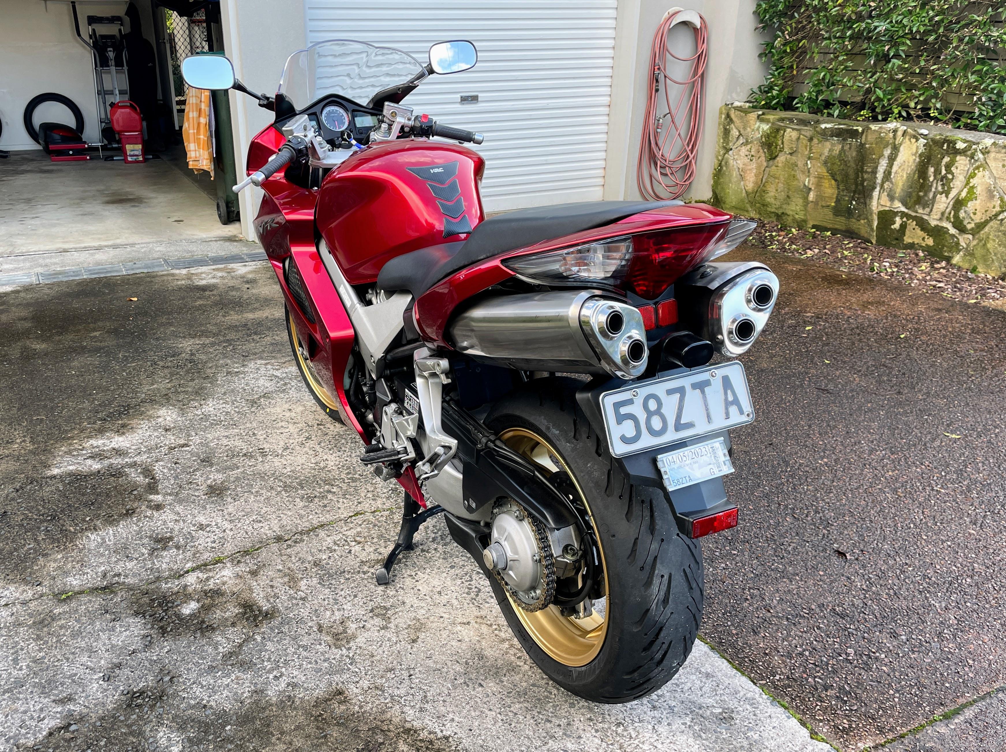 Member Contributer Popular Post Terry Posted July 12, 2024 Member Contributer Popular Post Posted July 12, 2024 I have been a confirmed fifth gen owner for many years, but recently a 2009 which had sat on the local auction site reached my "buy now" level. The bike has 85000km, and the PO had parked it in 2022 after an inspection failure due to thin front discs. I just so happen to have a complete set of near-new lovely gold wheels with discs that I bought speculatively 5 years ago. The bike also has the dreaded cam chain rattle at low revs, a cracked windscreen, leaking fork seals and very minor stationery drop damage, but the seller put zero effort into resolving any of those or even cleaning the bike for photos (or possibly at all, during his ownership...). His loss, my gain! I collected the bike last night and survived a chilly ride home which did not reveal any unexpected faults aside from weird handling due to low tyre pressures. I'm looking forward to peeling off the covers and giving this dirty bike a good scrubbing, and then setting to rectifying the faults. I am planning on trying the "two turns of extra spring preload" fix for the CCT but replacements don't look too expensive. I will also check out the valve clearances; as I don't want to buy the small dowels to lock the VTEC valves, can someone tell me what diameter rod I need to get to make my own? And no new post is complete without a photo... 12 Quote