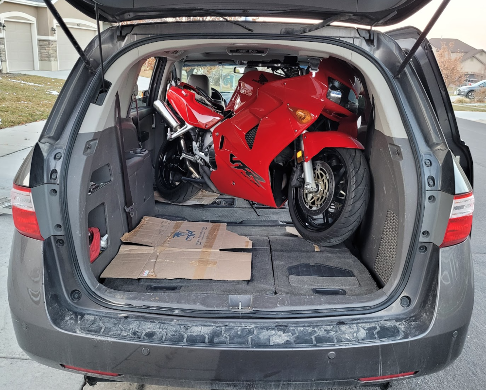 Hello again fellow Vifferini! Some of you may have read my long winded story here of getting back on a VFR after a 15 year absence from riding. I then posted the clean up thread here about that bike. Since purchase I have put about 10,000 miles on it having an absolute blast riding around the fine state of Utah, USA. The warm weather season is short but we do have a handful of excellent roads with endless scenery. The bike is set up just like my first VFR and it runs perfect. I couldn't be happier with it. Well, the plot thickens...which is to say I tracked down and bought back my original VFR. The one that I bought new in Northern California back in 2001. Yes, my actual exact bike, VIN #00089. Turns out the internet can be an interesting and effective tool. I actually got in touch with the owner a couple years ago but he wasn't ready to sell at that time. Finally, in recent weeks he let me know that he had upgraded and would sell it back to me, and at a very reasonable price. I was more than pleased, and my teenage son and I made plans to pick it up two states away in California. Not wanting to drag my small open trailer 1800 miles there and back, I wondered if a motorcycle would fit inside the wife's minivan. The Google machine quickly confirmed that I was not the first to consider this, as I found multiple pictures of various bikes shoehorned into spaces more commonly filled with soccer moms and soccer kids. That said, we had to test before the drive just to be sure. After some general measuring I figured that if we removed the windscreen and mirrors from my current VFR, we might be able to load it through the side door, which is exactly what we did. "Easy does it. Left a bit! Watch the ramp!" Success! Even got the doors to close with room to spare. Took it right back out and put it in the garage, neighbors shaking their heads, unsurprised at my usual shenanigans. So with that confirmed we made our way out to CA to pick up the original machine. Let me say this, one-on-one time with your kids is absolute gold. While going to get my old bike was cool, 20 plus hours in the car with my son was the real highlight of the trip. He's a fantastic kid and we had great time making new memories doing something that wouldn't make sense to most people. We arrived just after dark at the seller's home after a full day's drive. It was great to meet the gentleman and trade a few stories. I pointed out the small scratches on the clutch cover. "Yeah, that was me, trying to put it up on the center stand one day wearing flip flops and it slowly went over on it's side on the driveway. Not my first bonehead move." It was so cool to see that it still had every mod that I had installed more than 20 years prior, save the Sargent seat, but I'll just use the one from my other bike now. Looking over the bike further I noticed that he had the db killer installed on the Staintune, something I never used in my ownership. "Have you heard it without the db killer?" I asked, reaching for my set of Allen keys. "I didn't know you could remove it." he said. A few seconds later I had it out and fired up the bike inside his carport. Let it warm up for a bit and then gave it a few mild revs. "Whoa you can't have it now!!" he said jokingly, "I should have removed that a long time ago!" We both got a laugh. Every VFR guy has their favorite pipe, an uncorked Staintune is mine, though a period Micron is a close second. The Staintune look and sound just can't be matched. I removed the windscreen and mirrors, having done this exercise once before, and we loaded up the bike in the minivan. I strapped it down securely using the factory seat anchors and several ratchet straps. It was almost as if the van was made for this type of thing. We journeyed back home and put the bike in the garage, with some new memories and a new chapter to start. Seeing double, this looks familiar. The more recent left, modded to resemble the original, right. It even has my original plate on the back as plates stay with the vehicle in California. So what now? Get organized, make the punch list. Gotta go over everything to see that it is clean and up to spec. Fluids, charging system, brakes, etc, a nice winter project. The seller provided me with some receipts of maintenance he'd had done recently at a shop near his home. New plugs, valves checked (all in spec), new coolant and brake fluids. Mentioned an issue of stumbling in lower revs that the shop couldn't rectify. Also mentioned a slight coolant leak on the left side and a dent in the left radiator. Interesting but no worries, I have time to look over everything and make it right. When I sold the bike in 2006 it had 26,000 miles on it. Now it shows just 39,000 miles. I can live with that. In general it looks to be in decent shape still, just needing to be gone through a bit. I first removed the side fairings to have a look at things underneath. Hmmm...of the 18 or so fasteners I removed, only 3 were correct and all were finger tight or less. Luckily you can still order the correct ones from Honda. It's clearly been down on the left side at some point. The coolant leak is from an epoxy repair attempt at the bottom of the reservoir. Actually glad to see it's not from the engine casing as the reservoir is easy to replace. Odd repair though. The left rad is indeed dented on the bottom and the bracket bent slightly, though it is not leaking. It will work until I can get another one. When I removed the tail fairing some of the tool kit fell out of the left side, clanging onto the garage floor, and there is a small crack on the left of the tail fairing at the franken bolt insert. Yeah, it's definitely been down. But....(and it's a big but), whomever dropped it did put on an OEM side fairing so that's a win, and everything else I can deal with quite easily. I also took a chance to check voltage and saw 13.70ish at idle and a solid 14.44v at 4,000 rpm, right where it should be as far as I understand. I'll keep an