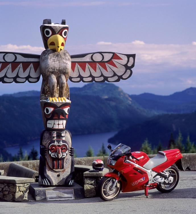 Spring of 1993 and I'd only had my '91 VFR for a couple months when I snapped this photo by Salish Bear totem atop Malahat Drive. Compared to many of the mountain passes I've crossed by VFR this is one of the lowest, but it is close by and offers a good view of Finlayson Arm - and, on a much clearer day, even the Olympic Range in Washington state to the south. Eagle-eyed viewers will notice the Bubba Shobert-replica Bell helmet. It looked cool, but my next helmet, a Shoei X7, was a huge improvement.13 points