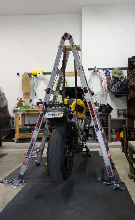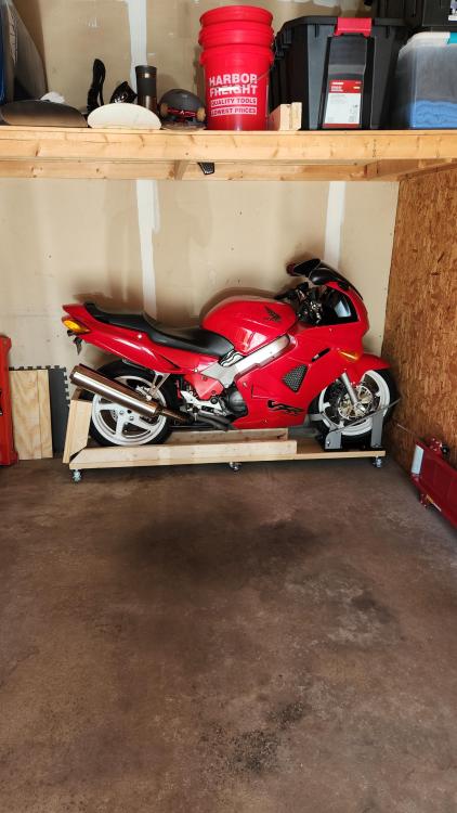 I live in an apartment with a small one car garage so space to store the VFR is limited. I tried a Harbor Freight motorcycle dolly but it was too long for what I needed so I decided to make one. I started by mounting the wheel chock on the end of the 2X12. For this I just drilled thru holes and used the mounting hardware that came with the wheel chock. I put the bike in the wheel chock and measured where I wanted to cut my 2X12. I put my cut line about 2" past the end of the rear wheel. This way the ramp can rest against the wheel during storage. I cut the 2X12 and then mounted the casters to the bottom using lag bolts and washers. The casters were the most expensive part of this build, about $10 a piece. But they have ball bearings in the wheels and roll really nice. Each caster is rated for 110 lbs. so I went with 6 of them just to be safe. I used the left over piece of 2X12 for the ramp (Originally I tried to get away with a 1/2" piece of plywood for this but it cracked right when I tried to roll the bike up it). I mounted the ramp with door hinges and the hardware that came with them. Next I added the side guides using the 2X4s. I cut a 45 degree angle into the ends where the guide on the ramp meet the guides on the main platform. These guides are really helpful. I tried to put the bike on the dolly without them it was very difficult to get the bike lined up properly. Getting the bike on and off is pretty easy but takes some effort. Because the dolly is so short the rear tire is still going up the ramp at the same time as you are trying to push the front tire into the wheel chock so you need some momentum. The dolly stays in place when loading/unloading the bike with all the caster brakes on. All in the supplies were about $200. I plan to store the bike on this dolly over the winter. I'm not sure if I will cause any damage to the front tire by storing it in the wheel chock. It's no deforming the tire much it's just kind of resting in there. Thanks for reading ,let me know what you think! Supplies: Qty Description Source 1 2" X 12" - 8' Lowes 2 2" X 4" - 8' Lowes 12 2" Polyurethane Casters w/Brake Lowes 24 1/4" x 1" Lag Bolts Lowes 24 1/4" Washers Lowes 12 3" Wood Screws Lowes 2 Door Hinges Lowes 1 Motorcycle Wheel Chock Harbor Freight9 points