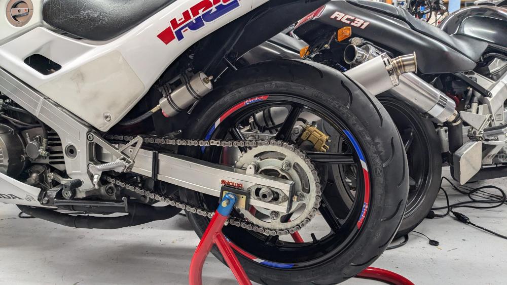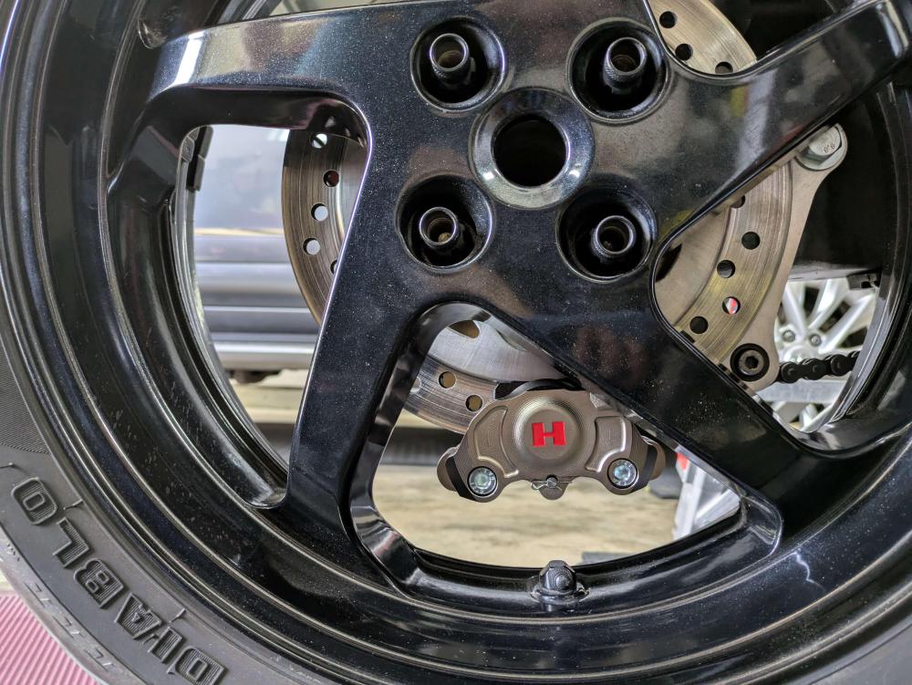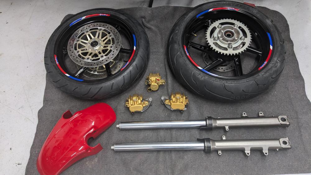 Been a few years of trouble free goodness. The bike continues to be very capable and fun. The need for new tires inspired me to put together a "RC26-II" Upgrade Kit. Restored F3 forks with RT Springs. F3 front wheel. Brand new front Nissin calipers and pads. F3 5.0" rear wheel with a matching rear caliper. New rear brake arm solution. Real clean and simple.12 points