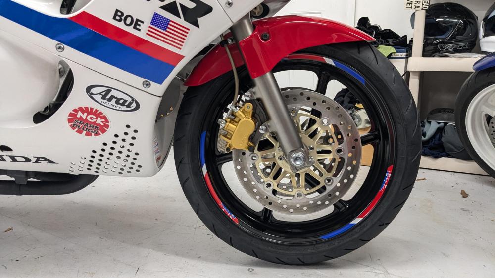 VTR1000F front wheel (to match the rear) with EBC rotors and a fresh tire. Replaced the valve cover gaskets (they were leaking) and re-set the valve lash, most were pretty loose. Had been planning to get in there sooner after rebuilding the bike and making sure it ran good and had all the gears. Fresh coolant since I had to drop the lower rad and did an oil/filter change. New brakes, wheel and tire feel great and the engine definitely feels crisper. Oh and I removed and restored the exhaust system collector, it was the last real crusty thing on the bike.9 points
