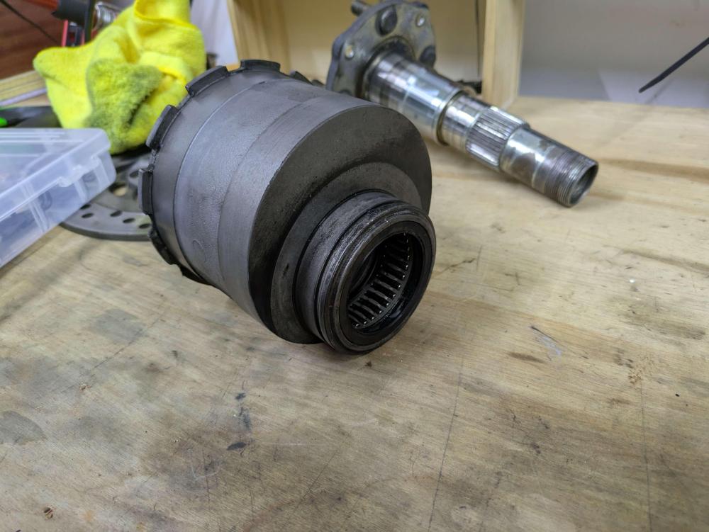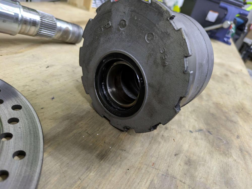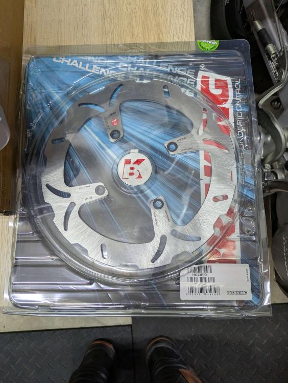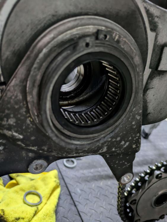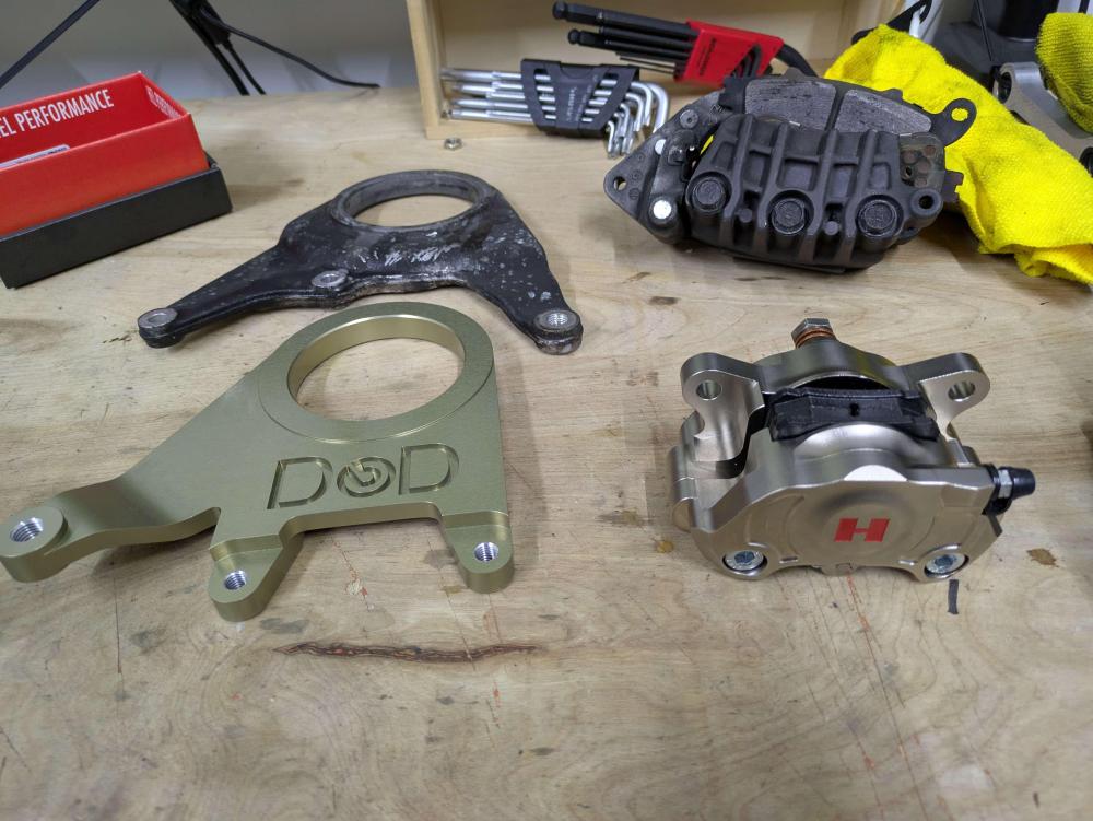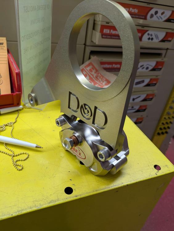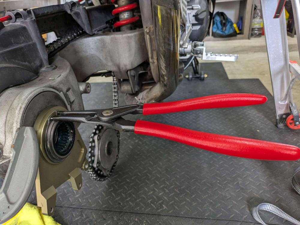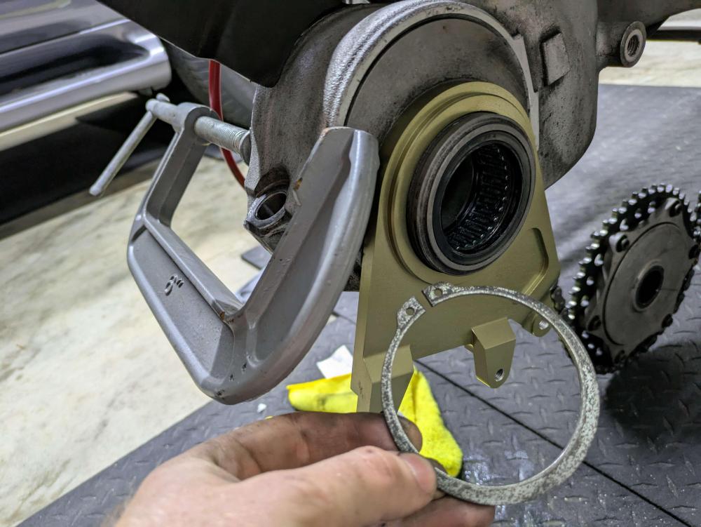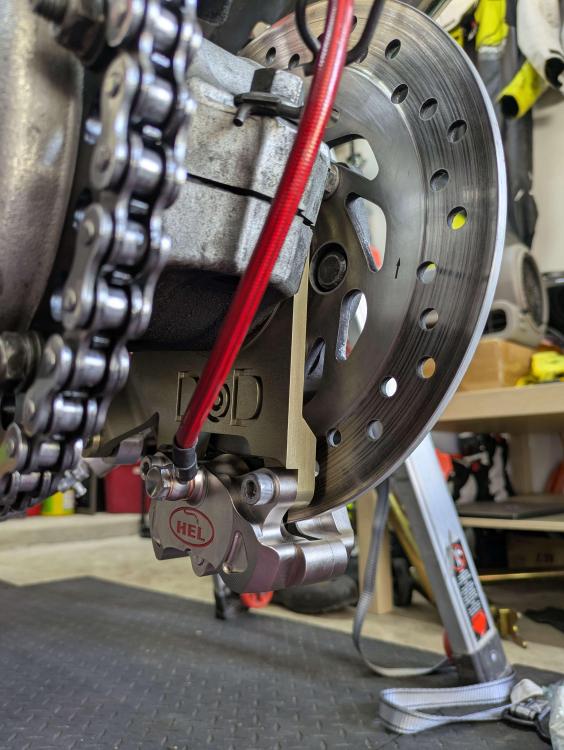 Well well well... the mad scientist strikes again. the ladder trick really did the work! It was VERY sketchy, but after distributing the load with a block of wood up top and securing transversely with easy-straps, I was able to confidently say the magic words "She aint goin nowhere" Next was to punch out the axle... and that was interesting! Quite easy to do, to be honest, and by some accounts on this forum, I consider myself lucky it were so simple. She's a little sour on the "left" (from rider position), but a good clean and grease & I'd wager she's good for another 60,000 miles 😁 Would love to poll advise from the viffer collective consciousness on this one. LMK how bad she is Now for the big battle of the job... Never have I ever struggled with a circlip like this before... I really had to muscle that bad boy off, and even then... I walked it off around its inner radius. (foreshadowing...) But we got there! Yee haw! a very scary job made simple. For years I was timid about taking the rear end apart, but it really is as simple as it could be! (challenging? Yes. Simple? yes. Such things are not mutually exclusive in my mind) Pics of the eccentric/bearings: And now for the whole point of this exercise... enjoy the eye candy, folks: Billet Hel rear brake caliper. And as pretty as she looks on the table... it was time to bring it all back together (and calm my nerves by getting this machine back on the earth!!) --- Reassembly --- So here we went... Step 1: Cir-clip ... well crap... this didn't go my way the first time, barely getting it removed. So what makes me think I can get it back ON.... After rummaging around town getting other bits I may need (across three hardware stores...), Ol Faithful Harbor Freight came to the rescue with the largest cir-clip pliers I have ever laid eyes on... That's right, folks. This Is how I got it back on. 🤣 After dying of maniacal laughter from my successes (and at my struggles from earlier), I press on to button everything up. All goes smoothly, and here's the end results... 🤤 Now... this job isn't complete, as I'll be back in there one more time to be sure that rear brake is clamping onto some kit as premium as itself... Stay tuned!9 points