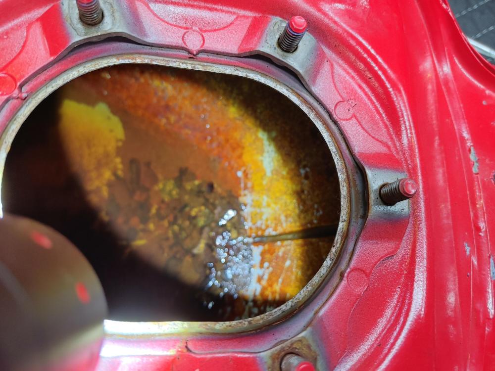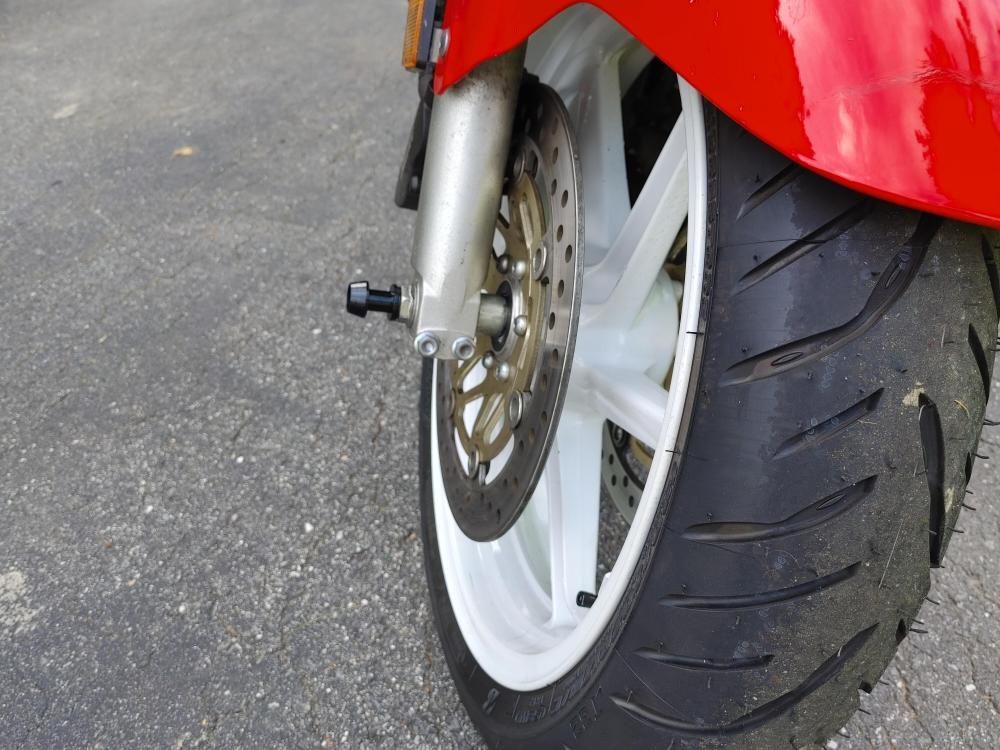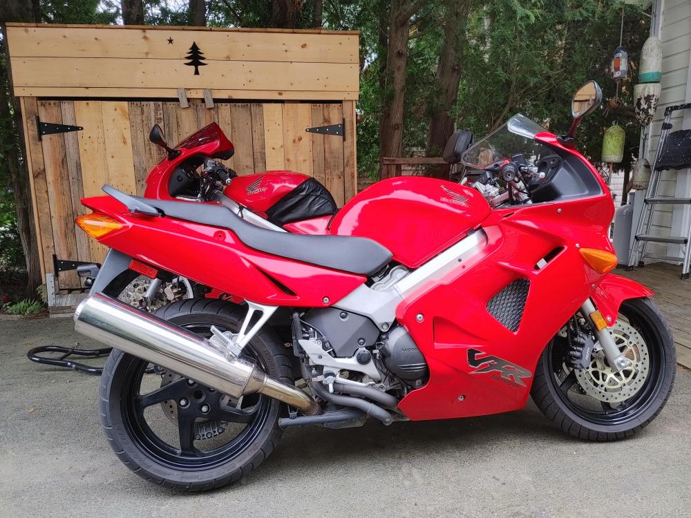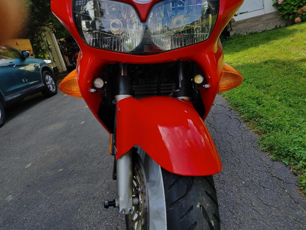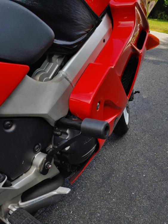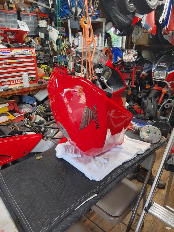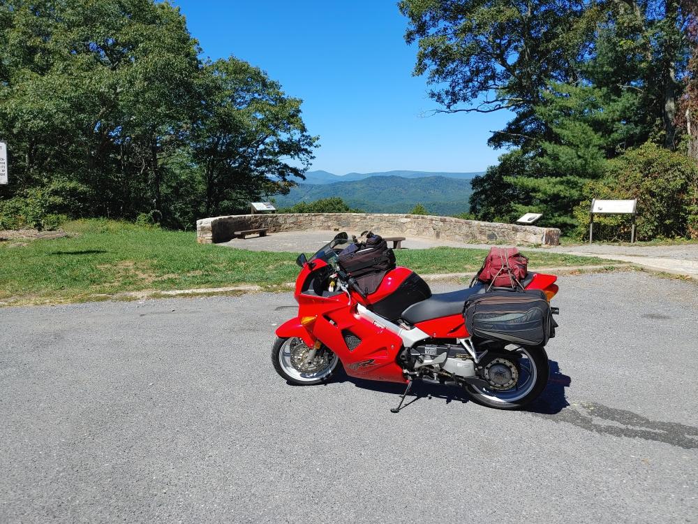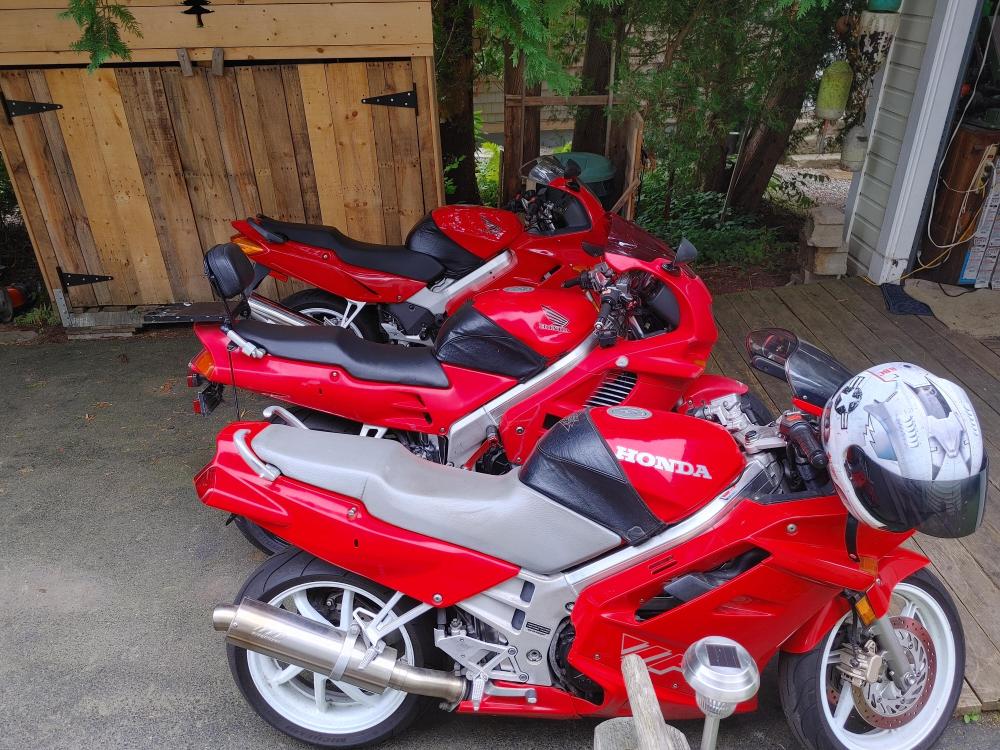 Bought this at the end of July. I knew it had issues as it sat for 13 years. Rusted tank 19 year old tires Original R/R Etc But it only had 11.5K on the clock So I spent a month cleaning the tank repeatedly, then treating it with Phosphoric Acid 3 times. This took awhile so in addition I built sliders/tip over protectors, went completely through the brakes, swapped my 8 spoke on to the rear and a new set of T32's, bobbins on the front axle just because I had them lying around, riding lights up front for Moose spotting, built some saddle bag frames and installed some longer heavier bar ends. Its odd but the bar ends on the VFR are exactly the same as on my VF1000R's After a couple of tests rides I took it on a 2800 trip down to VA,WV,PA upstate NY, VT NH then back to Maine I did encounter some engine surging about 1200 miles into the trip, but I made it back north so I'll address that in a separate post. Love the bike, a bit less sporty than my 3rd or 4th, but I bought it for touring, as my 4th has 114K and is showing it. My only complaint, and its not really a complaint is the braking system looks like it was designed by a bunch of French plumbers on their croissant break. First pic is off the trailer Next, the tank. Midway through the process. Tank clean My 3 red VFR's just because. Slider/tip over protectors Moose lights. Bobbins. Midway through building saddlebag frames. Bike at the top of rt 250 near the VA/WV line.1 point