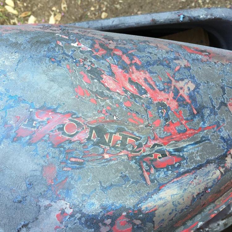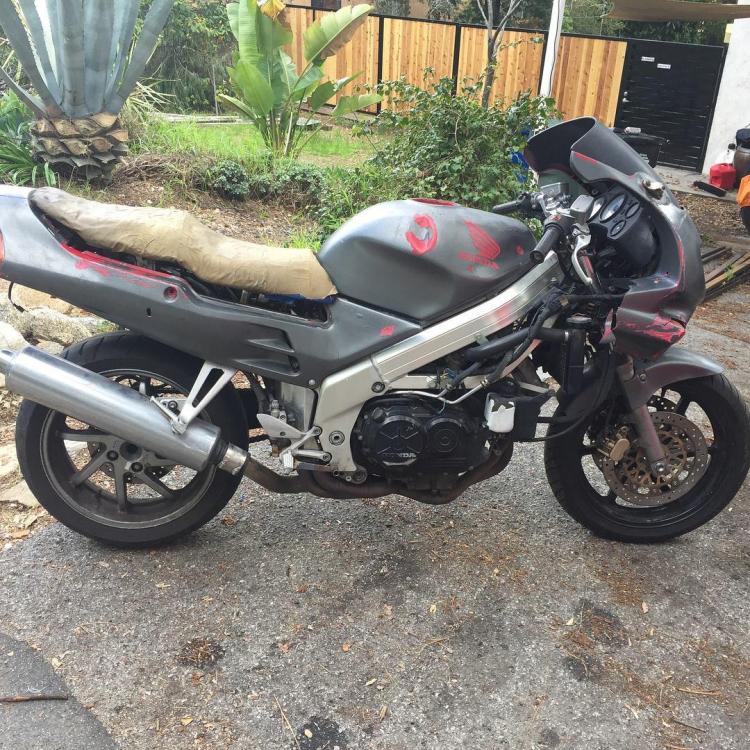 I purchased a 1997 vfr750 with 18k on the odo for $450 in March. Wasn't running but it had just rained and there was no gas cap. Took it home and swapped the spark plugs to find it ran perfectly, but had a lot of rough edges cosmetically. I'm a bit into the build already but heres whats been done so far. 06 cbr600rr fairing stay, ground down to match the frame upper bolt hole 06 cbr600rr fairings + headlight crappy handmade brackets as I figure out a sturdier solution drilled into cbr headlight to mount oil cooler tbr headers (came with the bike) tbr exhaust 8 spoke rear wheel (came with the bike) ebay levers hel front and rear brake lines chopped down oem speedo new fluids all around new coolant reservoir Pirelli Angel GTs ready for uppers awaiting mids Found underneath 4 layers of shitty paint