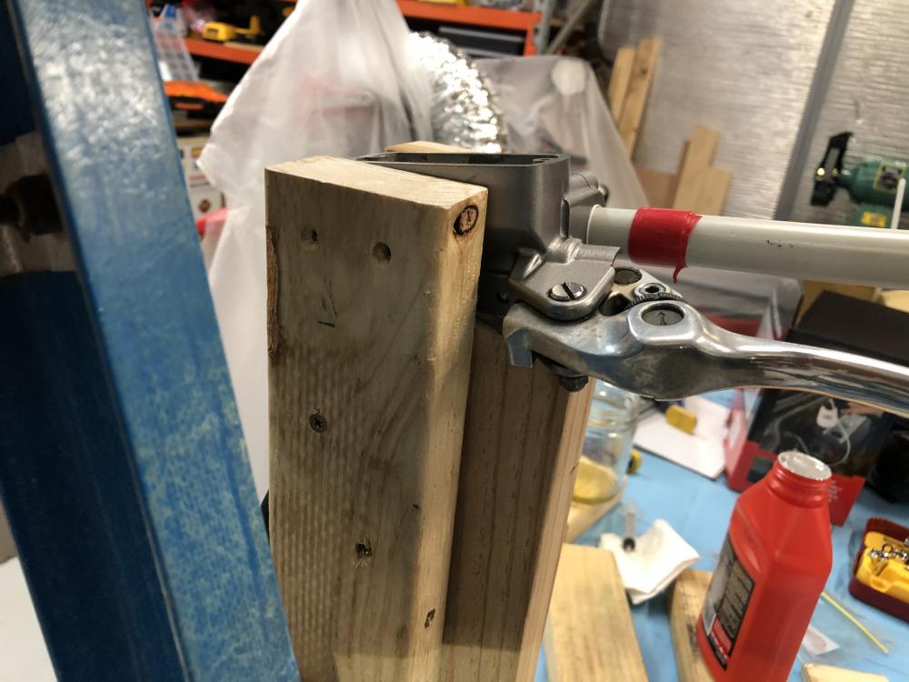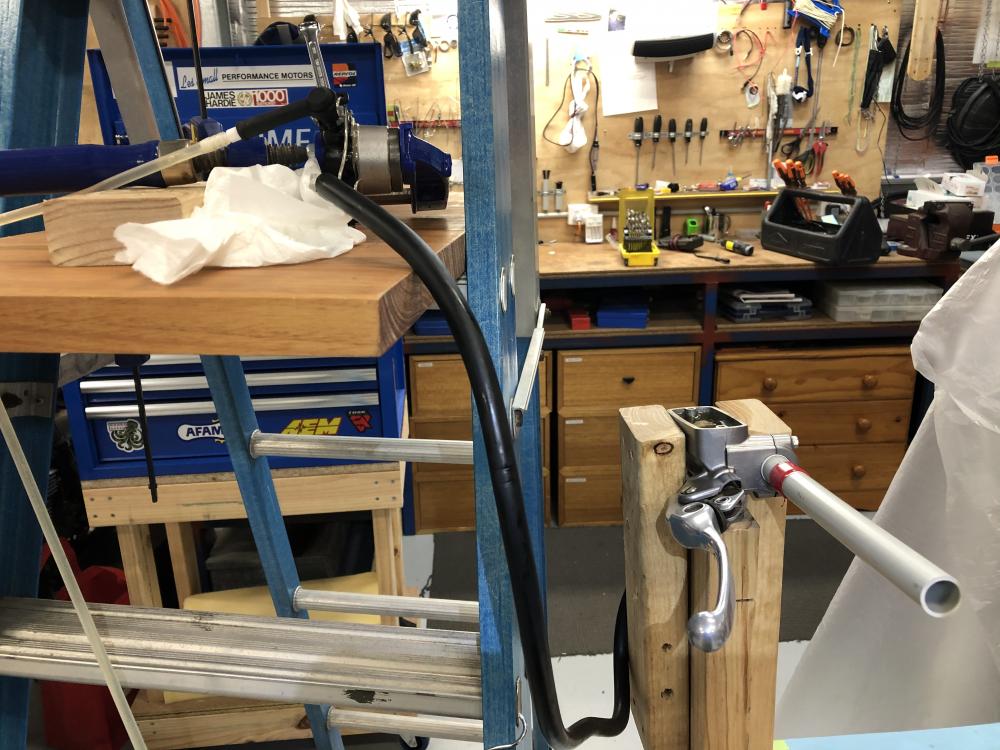 Hi everyone, I am trying to put a 1998 vfr back on the road and am having trouble bleeding the brakes. The bike has 17,xxx miles and was rideable as purchased but ran rough and didn't start easily. I have already done a tune up, added a VFRness, replaced and rebuilt the forks (bent in an accident), greased the head bearings, changed coolant, added speed bleeders all around and replaced all the brake pads. Clutch has already been bled and the lever feels very firm. There is also a long list of missing bits and broken plastic to deal with in time. Unfortunately the manual doesn't make much sense to me since I'm not using a vacuum bleeder. Bare with me as I try to explain. I have already used a few bottles of brake fluid attempting the bleed the brakes and all fluid is coming out clear. I'm attempting to bleed in this order: Front right caliper top bleeder (pump at hand lever), front right caliper center bleeder (pump at foot lever), front left caliper top bleeder (with caliper removed and tilted to help air escape, pumped at hand lever and secondary master cylinder), front left caliper center bleeder (pump at foot lever), rear caliper front bleeder (pump at foot lever), rear caliper center bleeder (pump at foot lever), and then bled at the proportion valve (foot lever). The rear brakes feels strong but the front lever is weak. I repeated this procedure when I continued to see air bubbles rising from the proportion valve bleeder, but I believe this is related to the secondary master cylinder. With all bleeders closed and pressing the rear brake lever firmly down I can hear some gurgling or squeaking in the lines up front. I can also hear something strange with the system closed and pumping the secondary cylinder manually. It feels like it's not moving much fluid, and appears to be moving barely any fluid at all out of the proportion valve bleeder when opened. However, pumping the secondary master cylinder appears to add air to the lines, because when I pump the secondary cylinder by hand and then press on the foot lever I get a lot of air out of the proportion valve. I have repeated this ad nauseum with four bottles of brake fluid to no improvement. The secondary master cylinder continues to feel like it hasn't been primed and just sloshes fluid back and forth, and whenever I pump the secondary and go to back to the proportion valve air bubbles still come out. Any advice?