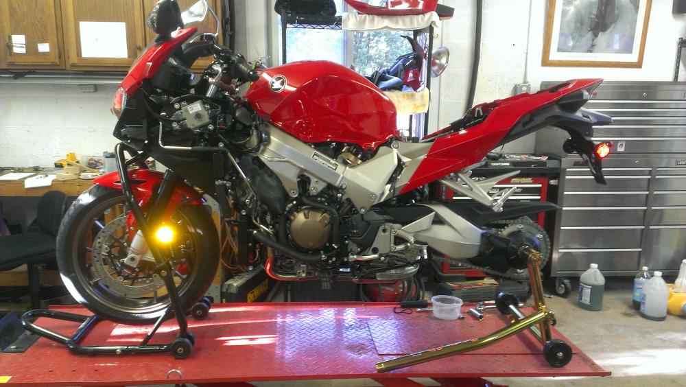 Hi everyone, I am trying to put a 1998 vfr back on the road and am having trouble bleeding the brakes. The bike has 17,xxx miles and was rideable as purchased but ran rough and didn't start easily. I have already done a tune up, added a VFRness, replaced and rebuilt the forks (bent in an accident), greased the head bearings, changed coolant, added speed bleeders all around and replaced all the brake pads. Clutch has already been bled and the lever feels very firm. There is also a long list of missing bits and broken plastic to deal with in time. Unfortunately the manual doesn't make much sense to me since I'm not using a vacuum bleeder. Bare with me as I try to explain. I have already used a few bottles of brake fluid attempting the bleed the brakes and all fluid is coming out clear. I'm attempting to bleed in this order: Front right caliper top bleeder (pump at hand lever), front right caliper center bleeder (pump at foot lever), front left caliper top bleeder (with caliper removed and tilted to help air escape, pumped at hand lever and secondary master cylinder), front left caliper center bleeder (pump at foot lever), rear caliper front bleeder (pump at foot lever), rear caliper center bleeder (pump at foot lever), and then bled at the proportion valve (foot lever). The rear brakes feels strong but the front lever is weak. I repeated this procedure when I continued to see air bubbles rising from the proportion valve bleeder, but I believe this is related to the secondary master cylinder. With all bleeders closed and pressing the rear brake lever firmly down I can hear some gurgling or squeaking in the lines up front. I can also hear something strange with the system closed and pumping the secondary cylinder manually. It feels like it's not moving much fluid, and appears to be moving barely any fluid at all out of the proportion valve bleeder when opened. However, pumping the secondary master cylinder appears to add air to the lines, because when I pump the secondary cylinder by hand and then press on the foot lever I get a lot of air out of the proportion valve. I have repeated this ad nauseum with four bottles of brake fluid to no improvement. The secondary master cylinder continues to feel like it hasn't been primed and just sloshes fluid back and forth, and whenever I pump the secondary and go to back to the proportion valve air bubbles still come out. Any advice?