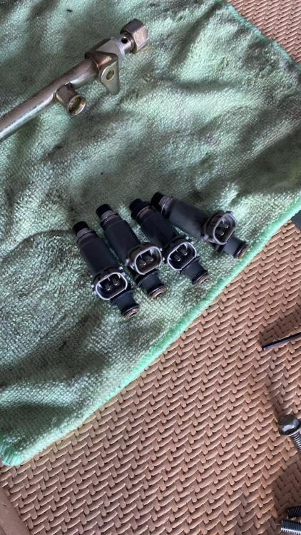 Hello all, I’ve recently purchased a 2002 VFR 800 (50k km) for dirt cheap off someone who had cracked the crankcase and couldn’t be bothered to have it repaired. This resulted in him leaving it sitting in his yard for just over a year and allowing rust to form in his tank. I managed to replace the crankcase cover and clear 99% of the rust out of the tank as well as replacing the fuel pump assembly, however, I had left the rest of the fuel system as is, After that it was running and riding fine, until I decided to dump some injector cleaner in it of which I used a little too much which caused the bike to stop running. I drained the tank and chucked in a fresh tank of petrol but when I started it it was sputtering and stalling with any blip of throttle and was shooting TONS of fuel out the exhaust so much so that it drained half a tank in about couple mins and made my garage a gas filled bomb waiting to blow. You can see in the photo the mist and even drops of fuel coming out After letting the bike use the rest of the fuel I thought it may be leaky injectors due to something being dislodged when I used the cleaner. I pulled out the whole fuel system but I’m not sure if 1. it’s worth somehow testing them and cleaning somehow or 2. if I should replace them. Or if it’s even the injectors at all and maybe the fuel pressure regulator. I’m no mechanic so any advice or suggestions would be greatly appreciated. I also noticed they are green injectors which when I researched online are very expensive to replace. So is there any chance the brown ones off the newer models are compatible as they are widely available for me. Thanks heaps Tom