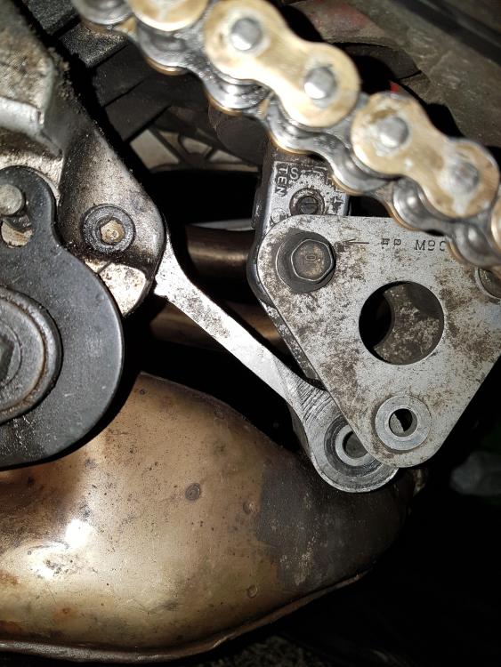Hi all, In the middle of doing a Nitron shock install on my 1999 VFR. All was going well, removed the linkage plates, found the top mount nut, and then I discovered I didn't have the large hex bit required to undo the bolt securing the connecting link. I attempted to undo the nut on the opposing side but suceeded only in rounding it slighty - it was tight as hell. So, one taxi ride to Halfords and back later and I have the hex bit, bit because it's so damn tight I rounded the bolt head - now I'm truly screwed. The way I see it, I cannot manoeuvre the old shock out of position without getting the connecting link out of the way, and I cannot get the top mount off the shock (to allow the shock to come further down and possibly allow me to articulate it out of the way) because access is so damn poor. I'm in crisis mode here - save me people!!!! The pic will hopefully show the extent of the problem.