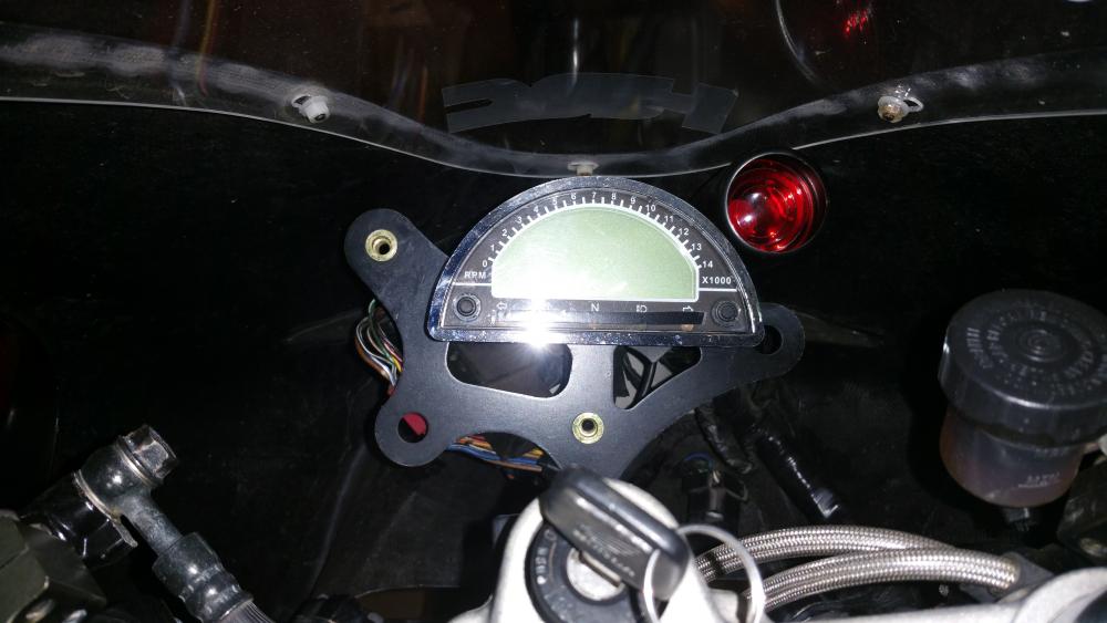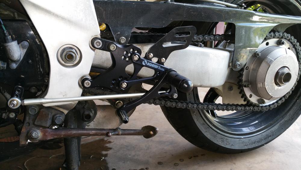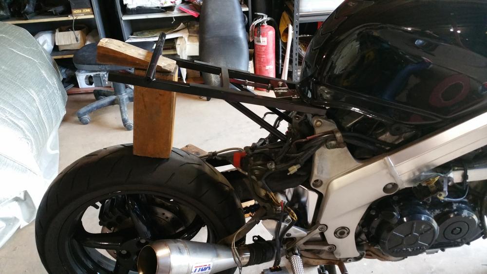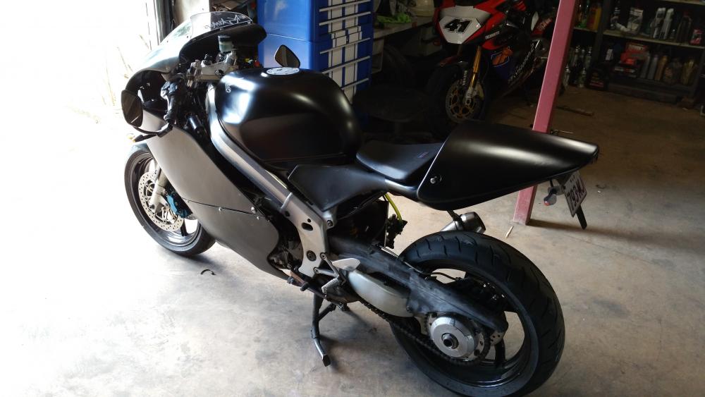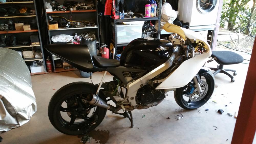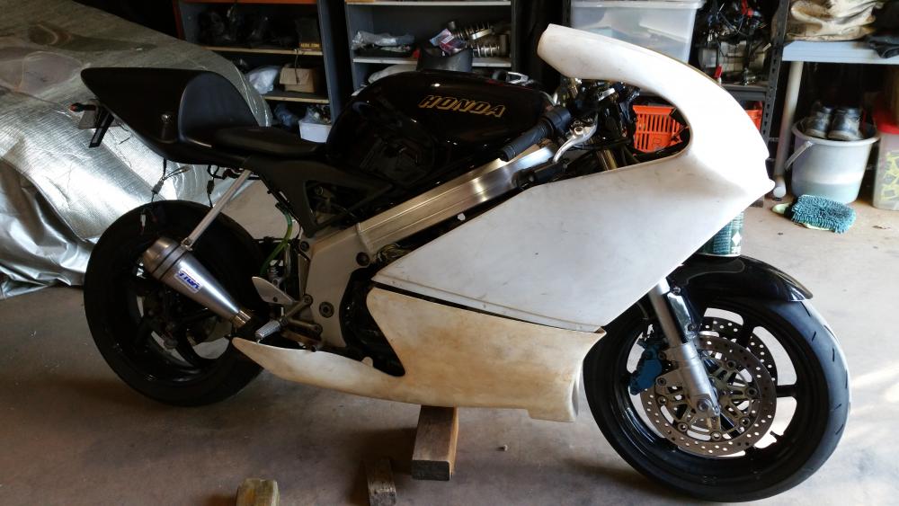 Hello, I'm not that much of a fan of forum's(to many people saying what can and can't be done) and i dont like 4 strokes (tractors) ........but horses for coarsers and I do like to try and help spark an idea or two. I'll start at the start. I bought a VFR 750 RC36 over a year ago to commute, I haven't commuted for many many years and to be truthful I've never ridden a sports-tourer, my first ride was nearly my last.......I never new a motor cycle could turn that wide and need so much effort.........must do something about the super long wheelbase and playing with the rake and trail. OK so after a play in the shed, if got the sag to 30mm (not ideal but it's the best I can get with the 954 rear shock) a home made top shock mount has given me some more ride height. A quick squint on ebay I found a company making a set of different lower suspension plates (they wouldn't make a set to my spec, so I welded them up and drill them where I wanted them) that will raise the rear 45mm add this with my ride height adjuster I'll get a shorter wheelbase, reduced rake, more weight over the front........it's worth a go. This was a step in the correct direction, but I found that other riders would push past and then hold me up in corners, I think due to the pipe and slippers look of the old girl, so she needs to loose weight (I'll take weight loss over BHP any day) gain more weight over the front, look like a race track refugee and a set of Dunlop 212 gp in medium............RC36 here we come. so a quick add on Gumtree had a buyer for the pipe and the fairing's and my lovely wife looking at a rolling chassis in the shed, I had a couple of days to get this up and running for work............fire up the espresso machine, it's going to get a little busy. After a look through my fairing collection I pulled out the TYGA fairings that I deemed to big to go on my MC21 SP (I've been waiting for my brother to highside his Gixxer thou to put them on.......but alas after 14 years I've given up waiting). A TYGA maggot muffler and the removal of the cat should give her a nice unsilenced note above 2,500 ish RPM (this should keep the locals happy till she is rolling), removing the snorkel from the air box and enlarging the intake 5% with 132.5 mj's has taken care of the mix. A mix of 636 and CBR rearsets has taken care of the feet and a set of clipons set up wiiiiiiiide has the hands somewhere to sit. what this has done has lost a lot of weight and sag is at 15mm........she steer's nicely, brakes better, changes line like a squirrel on speed So that's DemiRacer part one