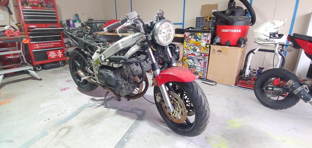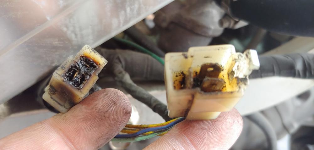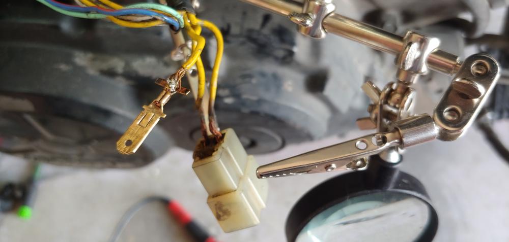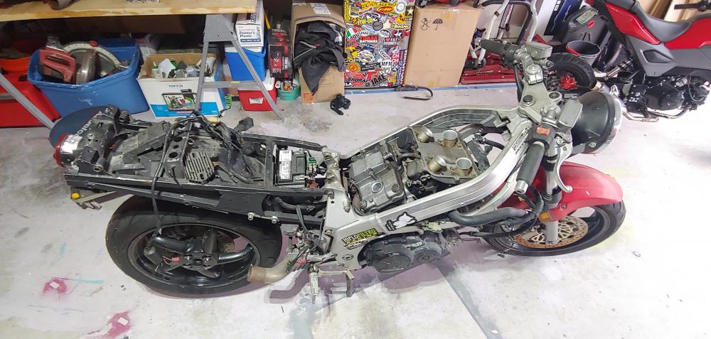 Hello all! I recently bought a 95' VFR750 basket case with the intensions on having a fun daily driver and to knock a bike off of my bucket list of 'bikes to own'. After purchasing it and getting into my garage to give an in depth look over, the thing is in VERY rough shape. The bike is in pieces (hence basket case) with every electrical connection disconnected from it's original place and no service history or proof of actual mileage. The wiring has been hacked up and eaten up by mice it looks like, over the years of sitting, and after pulling the plugs I found oil on them, one heavier than the others, which concerns me. Below are some pics of the bike after it was unloaded from the truck. I got discouraged after the in depth inspection of the condition of the bike, but after looking into several threads by other members, I am confident I may be able to get this one at least running/ road worthy. The title is bonded so not too worried about returning to stock or making anything pristine, so my plans are to make it into a 'street fighter', 'naked' build. My first trial with the 'Disaster' was trying to see if it would at least crank with the battery provided after having it sit on the tender over night. That did nothing... but keeping in mind the battery hadn't been used in 4-5 years along with the rest of the bike I wasn't too concerned. I then ripped a battery out of my other bike and tried that, and got nothing. After a night of more thread reading and a further look at the manual I had another set of things to check the next day. So this morning I checked the main connections to the battery, 30 amp fuse and starter relay.. that's when I found this.. After some short video tutorials on wire/ connector repair, and keeping my VERY small budget in mind, I decided to try and salvage/ repair the existing burnt up connectors the best I could to see if I could at lease get the bike to crank. I made the below repair, using my cheap Radio Shack soldering iron I purchased several years ago, but it gave out on me halfway through the joint. So that's where I'm at, I'll purchase a new soldering iron tomorrow and get to work repairing the rest of the connectors and wires as much as I can. The community surrounding these bikes seems pretty amazing, so I'm looking forward to anyone willing to offer advice and insights and seeing if I can keep another viffer on the road.
