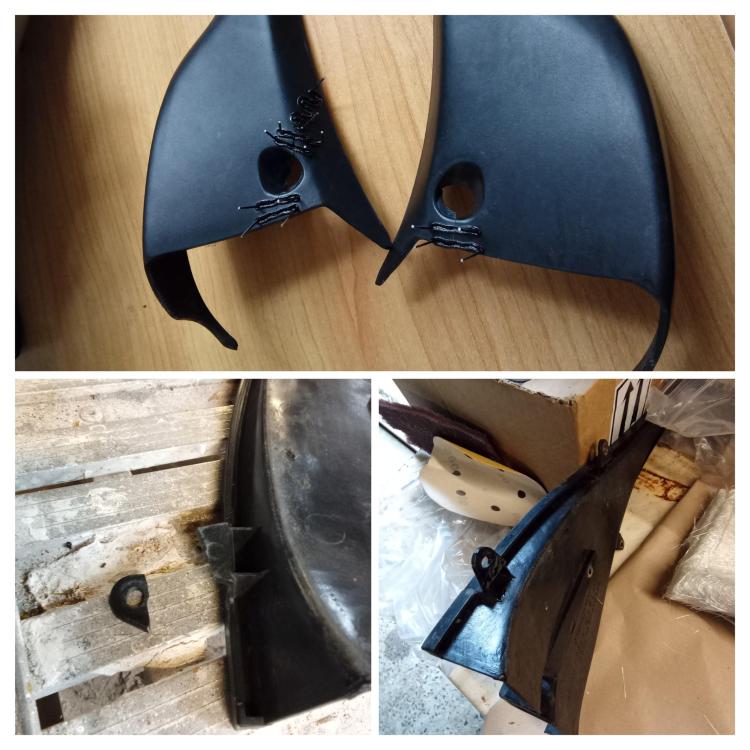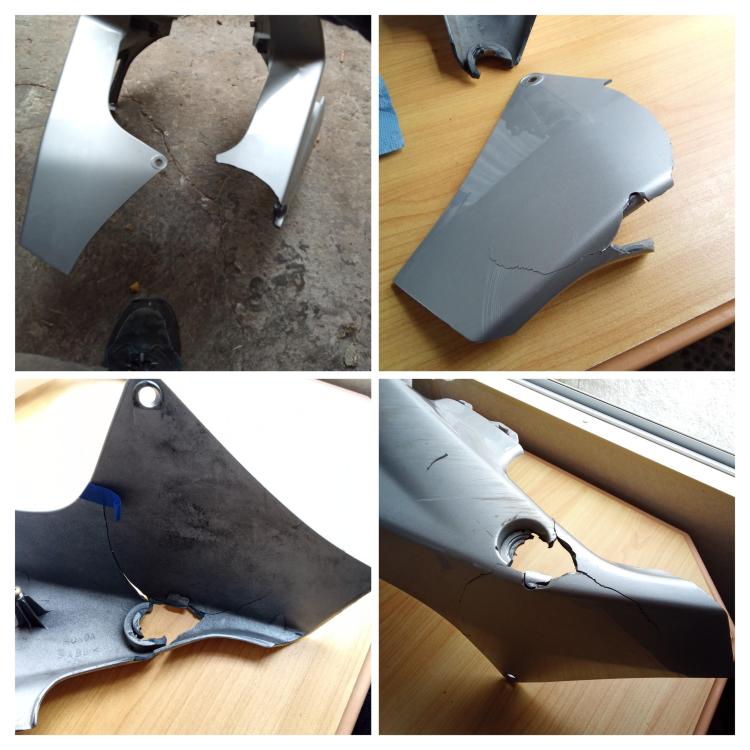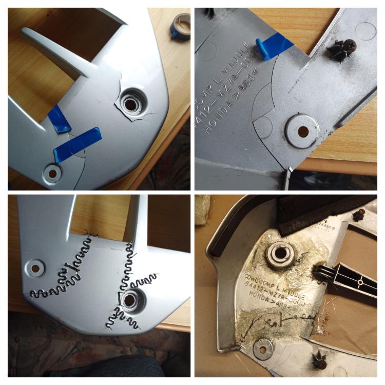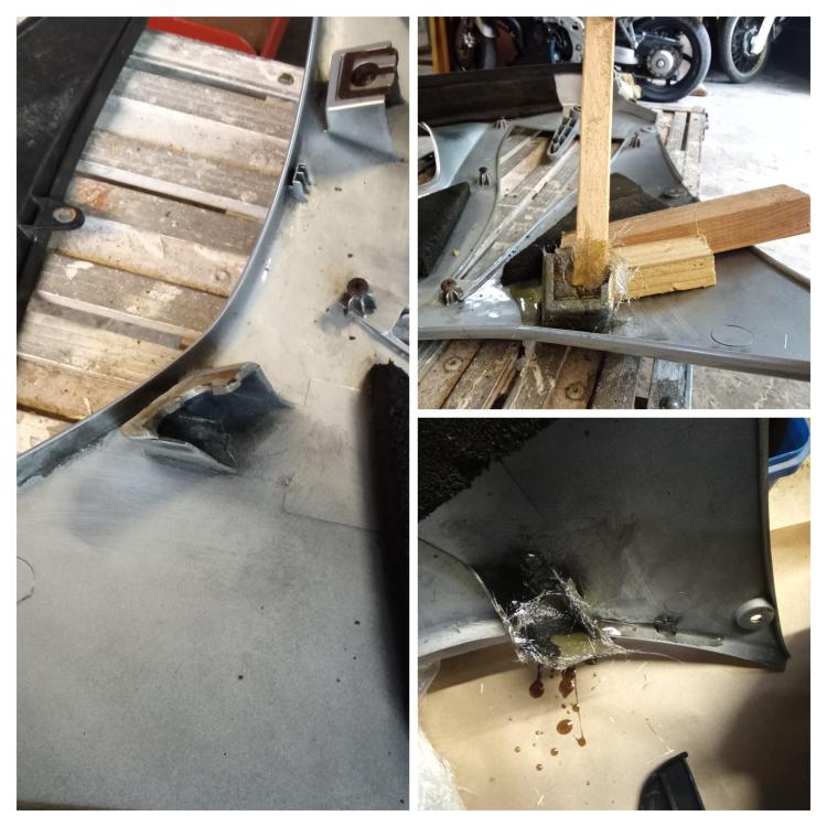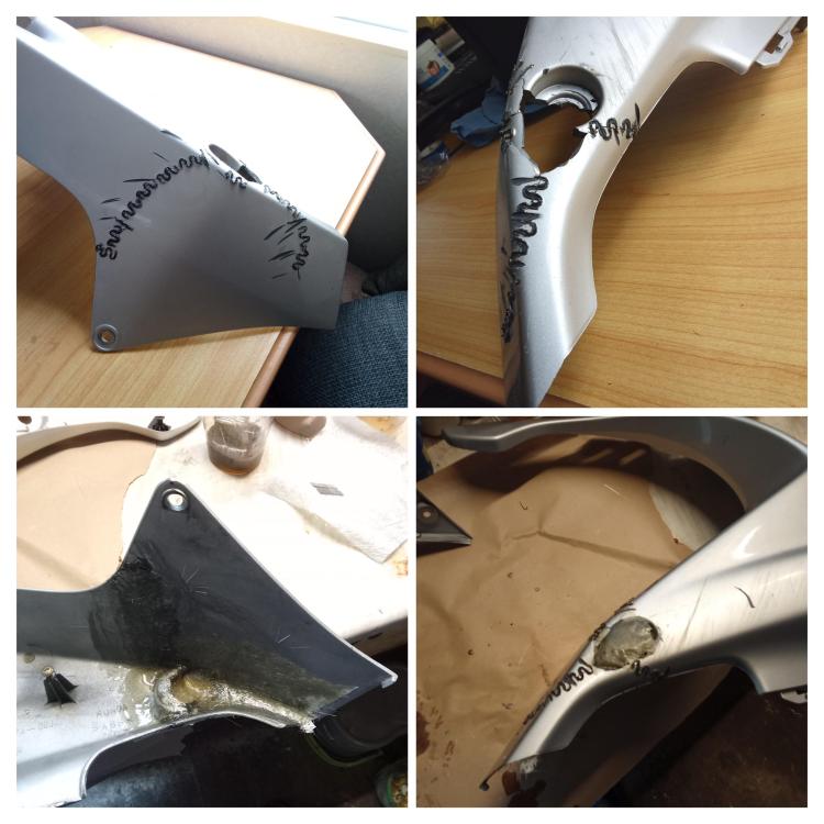Hi there ! Following a wee accident, I'm taking the chance to cherish my VFR this winter. I thought the process of repairs and the painting might interest a couple of members. Please feel free to make any suggestion Cheers ! Here are the work done so far : Plastic repairs with hot staples, reinforced with fiberglass and resin at the back