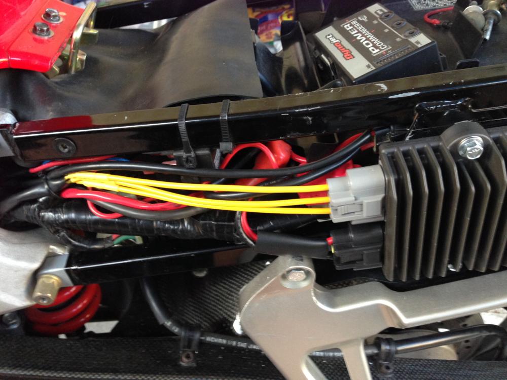 Hi all! I just acquired a 2004 VFR800 (non ABS) with 29,000 miles on it. All was well for about 200 miles, and then it died. The person riding in front of me said that the headlights started getting dimmer and dimmer and then went out just shortly before I lost power. I got the bike home (fortunately only ~70 miles from home), and started diagnosing. The PO was not sure whether the RR or stator has ever been replaced. The battery was replaced in the past year or two with a Battery Tender Lithium Ion battery. The battery was dead, so I charged that. When I started testing, it was sitting at 13.14V. Checked again this morning, and it's sitting at 13.13V so the battery seems to be OK. I tested everything and concluded that I had zero charging going on but it seems like the stator is OK(?). In the process of testing, I found that the connections between the stator and RR had overheated and were likely non-conductive. The char looks recent so I suspect they melted/charred during my ride. I rewired the connectors and tested again. Results: First test (before rewiring, with low beams on): IGN Bike Measured Reading OFF OFF BAT - + 13.14V ON OFF BAT - + 12.78V ON IDLE BAT - + 13.00V (rising) ON 2500RPM BAT - + 12.50V (falling) ON 5000RPM BAT - + 12.50V (falling) Stator tests: Impedance between phases: AB ~1ohm, AC ~1ohm, BC ~.9ohm Impedance to ground: A->G infinte, B->G infinite, C->G infinite AC Voltage: IDLE AB 24.2 AC 24.5 BC 23.9 5K AB 64.5 AC 64.5 BC 65 After replacing yellow stator connections (low beams on): ON IDLE BAT - + 13.20V (rising) ON 2500RPM BAT - + 13.45V (rising) ON 5000RPM BAT - + 13.58V (rising) A few notes: For the impedance tests, the ohmmeter that I am using is not close to instantaneous. When I put the leads directly against one another it rapidly declines from 200ohm to 5 then 3 then 2 then 1.5 then 1.4 then 1.3 and so on. With each downward tick it takes longer (from 200-1.5 takes a second or two, then it takes a few seconds from 1.5 to 1.0, and then approximately ten seconds per 0.1 tick beyond that. I suspect that the stator impedances are lower than 1.0 or 0.9, but I either need a new meter or to be dramatically more patient waiting for it to settle. For the "rising" and "falling" statements, once the voltmeter settled on a voltage (which is fairly instantaneous), I am stating that the voltage is slowly ticking upward or downward. Over the course of 30 seconds at a particular RPM, I would se a rise or fall of approximately 0.15-0.50 volts. There are no electrical accessories on the bike. After fixing the stator->RR connections, when I ran the 5k RPM voltage test I saw the 30A fuse wire start smoking and it was quite hot to the touch. All of that leads me to some questions: Is there anything about a lithium ion battery that would result in me not seeing a higher voltage across the terminals? I've never dealt with a lithium ion battery in a car/bike before so want to make sure that I should expect the same testing behavior as I would a conventional battery. At this point I am planning to rewire the bike (mirroring a VFRness) or order a VFRness and install that. Also, following my tests, I'm going to rewire my crimp connectors (stator<-->RR) with soldered connections. Should I go ahead and order a RR at this point too or do my results seem potentially within the realm of "normal" for overheated/deteriorated wiring? Should I get the wiring squared away, test again, and then decide whether to acquire an RR? In general are the failures frequent enough that I should just keep a spare RR on hand (or on the bike when I'm on trips)? Is there an expected lifespan for a Honda OEM RR? Does 29k miles make it "due" for replacement? Am I way off base on anything I've said that I need to be corrected on? Thank you in advance!