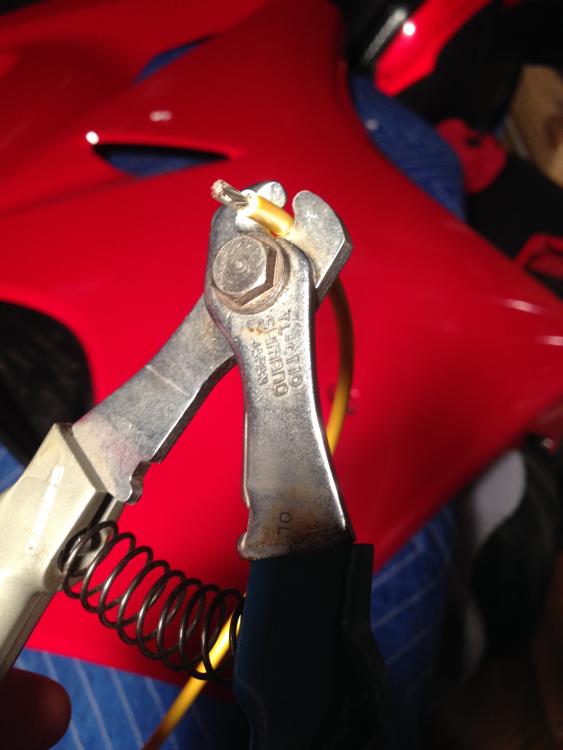 I replaced the original OEM regulator/rectifier [r/r] on my 2001 5th gen with a Shindengen SH847 series-style r/r from roadstercycle.com. There were no problems evident with my elecrical system, but with 48,595 miles on my old[ish] VFR, I might be on borrowed time with the all-original wiring, stator and r/r. I read through the pinned threads on the vfrd electrical forum: 'stator tests', 'electrical upgrade', and 'tips and tricks' - thanks to everyone who contributed their advice and experiences to these informative threads. Thanks to Duc2V4 for his guidance and for introducing me to roadstercycle.com and introducing me to Jack, the craftsman behind the roadstercycle website. Special thanks to Jack for his excellent suggestions, products, service, and for showing me his amazing shop and machines. Readings before beginning project: 12.9v on the battery with ignition switch off 0.8-0.9ohms across all three stator legs when disconnected from r/r [my meter reads 0.6ohms when I short the two probes together] No continuity from any stator leg to ground 19-20v on all three stator legs at 1200rpm idle [engine temp 174F] 61-63v on all three stator legs at 5000rpm I neglected to check battery voltages with engine running before I began I used this nifty $20 voltmeter [It also has two USB charging ports] from ebay for continuous battery voltage display - plugged it into my always-on steering stem power outlet. I compared it to my multi-meter, and they displayed the same voltages: Here is the original OEM r/r with leads disconnected: The connectors on the cables coming from the stock r/r didn't look bad, though the connector on the stator wires was a bit discolored: The series-type SH847 is $50.00 more than the popular mosfet SH020AA, but operates on demand instead of constantly, runs even cooler than mosfet, and has a 50 amp capacity. I went with it because I've been doing track days and don't want to challenge the r/r if I have to unplug the lights before taping them over [the headlights melt through polyethylene tape if you leave them on after you tape them over - ask me how I know]. The SH847 connectors are built onto the r/r. Roadstercycle sells the SH847 as a kit and makes up the connectors/cables for the battery and stator leads from 10 gauge marine grade wire: The SH847 is a physically larger unit - here it is next to the stock r/r: Before purchasing, I made an actual size mockup and taped it in place to test fit it under the rear cowl in the stock r/r location. It would have efficient cable routing and clear the cowl and passenger rear set assembly if oriented with the connectors facing forward, which would mean the cooling fins would be perpendicular to airflow as I perceived it. Jack said the series-type and mosfet Shindengen r/r's don't care about airflow direction: After visiting roadstercycle.com, receiving an education and a tour from Jack, then picking up r/r kits for my bike and for member Hammerdrill's 's 6th gen, I fit the SH847 in place, mapped out its location, and marked where to drill the top mounting hole [Yes, I cleaned up the hole with a rat tail file after drilling]: This left the new r/r's bottom mounting hole just below the bottom rail of the subframe. I hate mixing SAE and metric fasteners [I never know if I'll remember the right size tools later], but my best mounting solution was the threaded endpiece of this 1/4-20 draw bolt. I used the threaded piece to grab the subframe from underneath by threading it onto a bolt running through the r/r's bottom mounting hole: I cut a 1/4-20 flange bolt short enough that it wouldn't grind into the plastic fender behind the subframe, cut the bottom rear corner off the threaded draw bolt piece so it could clear the fender when pivoted up to grab the subframe securely, then loctited the threads and cinched it all up with stainless washers between the mounting bolts and the r/r: Roadstercycle's kit comes with finished battery cables. I asked for 11" battery cables, but Jack wisely recommended 12" lengths. I'm glad he did, because they fit like this [The nearest black and red cables in this photo are the leads from the new r/r and the red fixture on the left with two bumps on it is the 30amp circuit breaker that Jack builds into the kit]: Per the instructions, I taped off the now unused connector that ran from the wire harness to the old r/r and fastened it out of the way: The kit comes with 18" stator cables, solder-on sleeves, and crimp connectors - you choose whichever connector you prefer. I cut the stator cables to length using cable cutters. I like actual cable cutters for stranded cable because they capture the strands and compress them together so the strands don't get crushed and spread apart between the two blades of regular wire cutters or dikes. Next was to solder on the sleeves, followed by completely forgetting to take photos of the cables in my solder jig, but there's not much there to imagine. Roadstercycle has a good video on how to solder connectors. Just before heating the last piece of shrinkwrap onto the last finished stator connection, I remembered to take a photo: That's it. My final electrical readings are all the same - I didn't change out the stator or battery. I finally took battery readings with the engine running and got 13.3v at 1200rpm idle, 14.5v at 5000rpm.