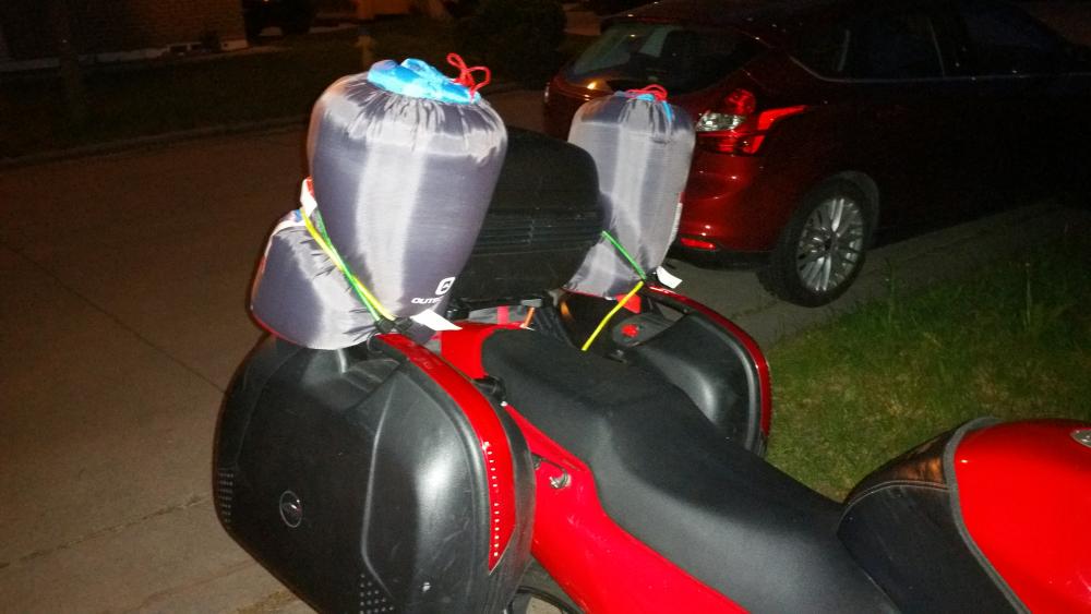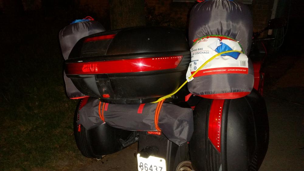 So, my wife and I were supposed to go to Cedar Point for three days next week (Monday through Wednesday) but we found out she is expecting (a while ago) and that means roller coasters and amusement rides are out. Before she hits that uncomfortable stage, we decided that instead we were going to go on a small-ish tour for 5-7 days (we're allowed some flexibility here). We will be leaving Windsor on Monday, and then riding around the bay, up to Sarnia, from there we will be riding along the lake to Owen Sound, and up Bruce Peninsula, at the northern tip, we will be taking the ferry over to Manitoulin Island, riding north, and crossing the oldest working swing bridge in the world, further north than east to Sudbury to visit some old friends, then east again to North Bay, then south to Huntsville, again for a reconnection. After that, we will be heading to Vaughan to stop by at my sister-in-law's and then Niagara Falls, after that, we will be traveling along Lake Erie on our return trip home. Fortunately, I had a bunch of lieu time at work, so took two days off, which finally gave me time to do things I've been meaning to do for a while. Bled the cooling system, added my USB Power, which will complement my clutch reservoir RAM mount that should be arriving tomorrow along with my phone mount, killed my battery in the process (after several starts, I very intelligently left the key in the ignition and left it on), I freaked out because I thought it had something to do with the USB charger I had installed, jumped the bike and ran around town to charge the battery. Good news is, the bike seems to run at about 85C now instead of nearly 100-110, and I'm not afraid to idle. I also heard the fans for the first time since getting the bike. Need to top up my brake fluid next. But that is a job for tomorrow.