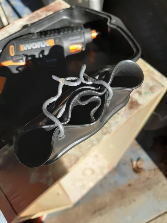 An after market alloy radiator and red silicone hoses. Had to make up a new bottom stay. no problem, had a HP server rail that was the correct width and thickness. Cut to length and drilled 2 holes. looks like a brought one! -