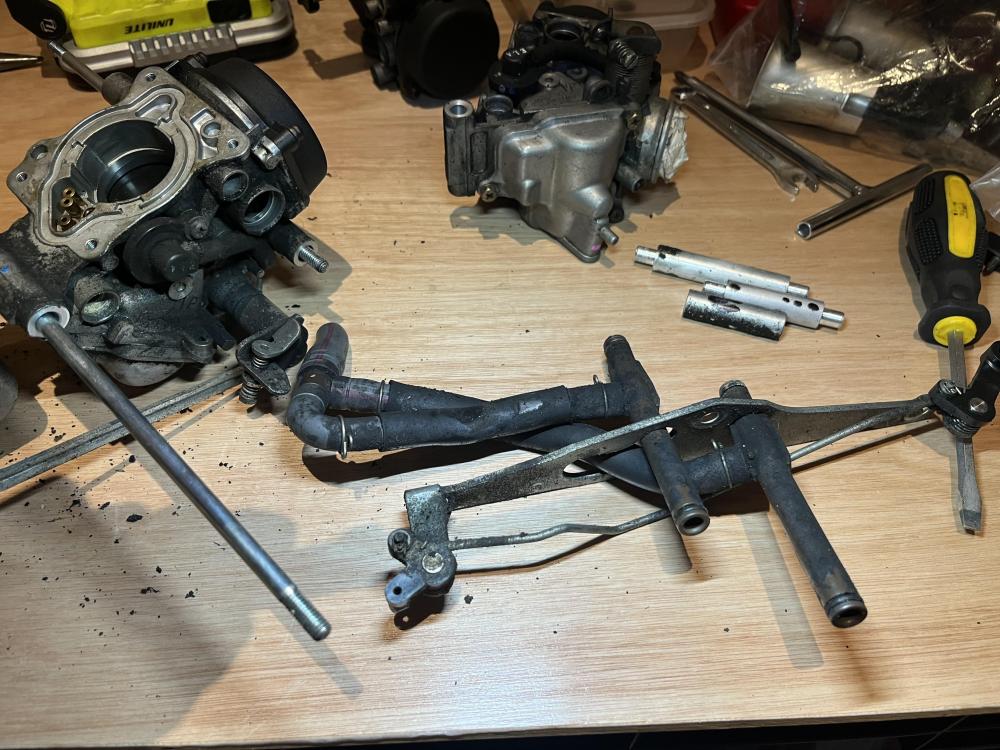 4. I'm doing a full strip and rebuild of the carbs on my 1997. It's 29 years old, had been standing a bit in the covid years and one of the carbs is flooding. I'd rather do this myself and learn than not know what has happened to them at an average shop or hunt down a specialist. I'm following the Honda service manual with Haynes as a backup of necessary. There are two sets pictured earlier on in this thread as I had designs to, well have two sets, but more about that later. For now, just ignore the cut fuel pipe, if you notice. Air plate screws out and lifted off.