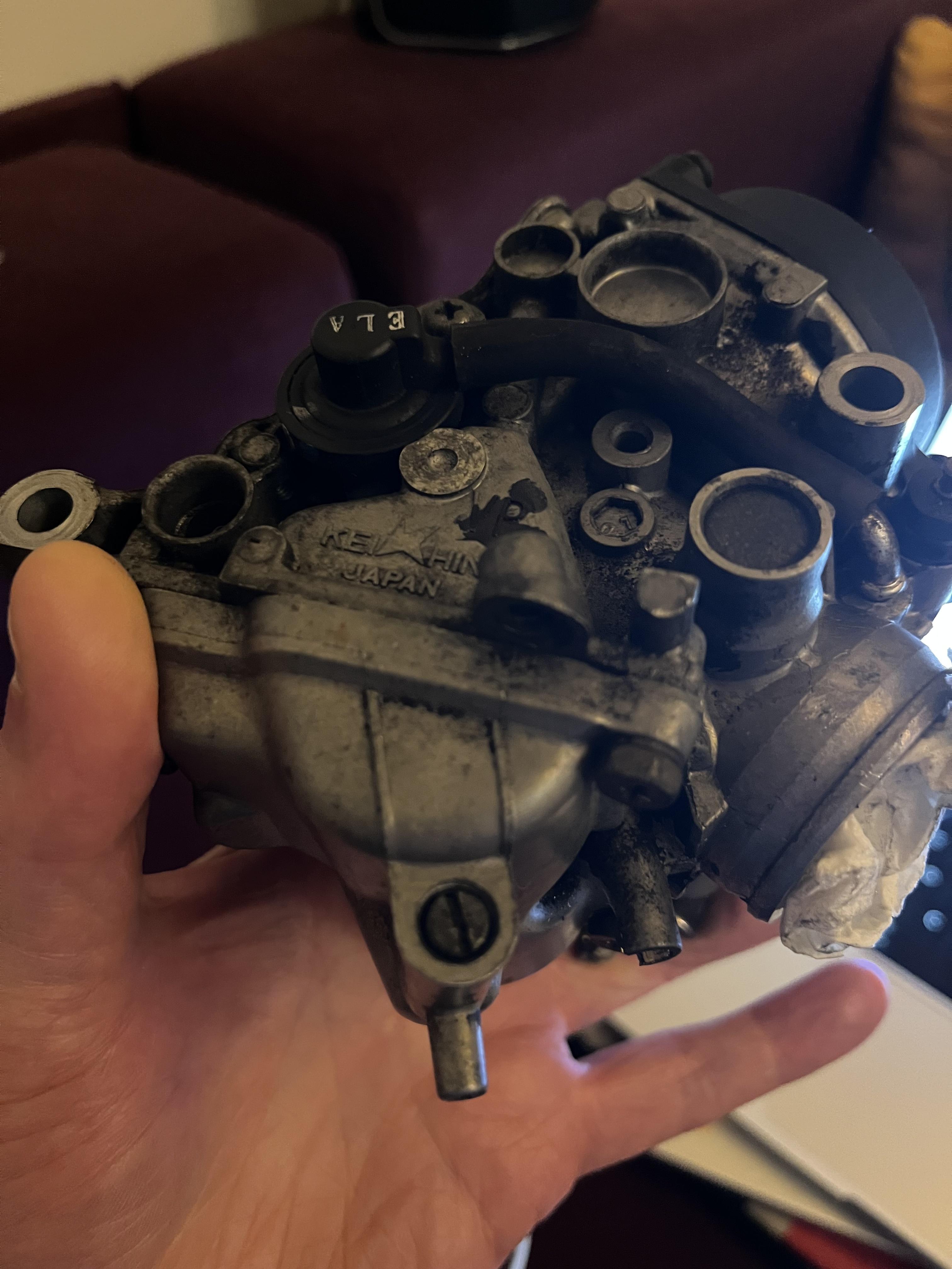 6. I carried on worming my way towards the front valve cover last night, the throttle bodies came out easily, all the clamp screws are accessible from the left side but you will need that looong screwdriver to reach the front right intake, and there is a clip holding the coolant air bleed hose to the underside. At that point I decided to carry on and pull the radiator off, again no big deal, two large and one small hose to remove, three bolts and handful of electrical connections. And a bucket of coolant. I had quite the collection of road stones caught between the camcover and radiator. I gave the bottom of the V a blow out with compressed air which covered me and the other contents of the Mancave with a layer of filth. I will be giving the frame rails a bit of a scrub down to remve the salt corrosion that is visible. There's a complicated plastic heat shield that sits atop the camcover and wraps under the wiring loom and over the spark plug coil caps; in hindsight getting the plug wires and then the coils up/out might make sneaking this out easier, and there were a couple of cable clips that needed to be released as well. After all of that I reached the camcover and had my first brain fart; the rear head, which is slim on the 1200, has only three hold down bolts and I kind of assumed the front would be the same and was wondering why the heck it would not budge until I found the fourth, centrally located bolt...In my defence, it was actually hard to see, hidden by the breather chamber from the back and the PAIR valve on the front. Access for the exhaust tappets looks much easier with the radiator removed, and I will move on to check and adjust these this evening (hopefully).