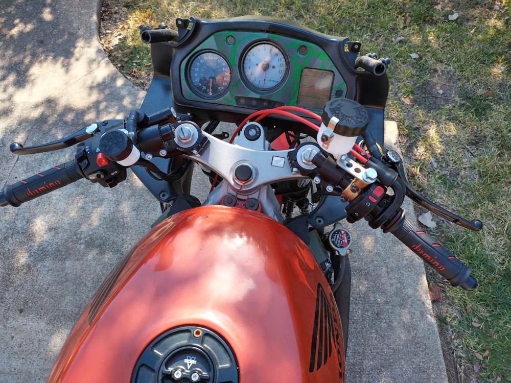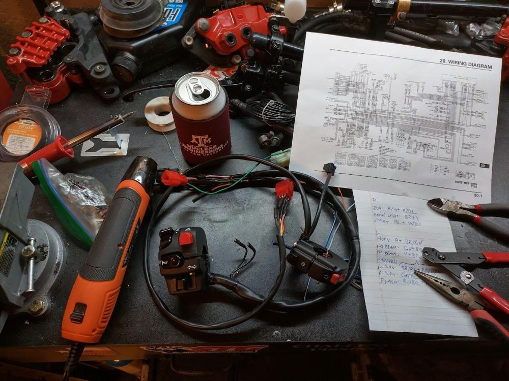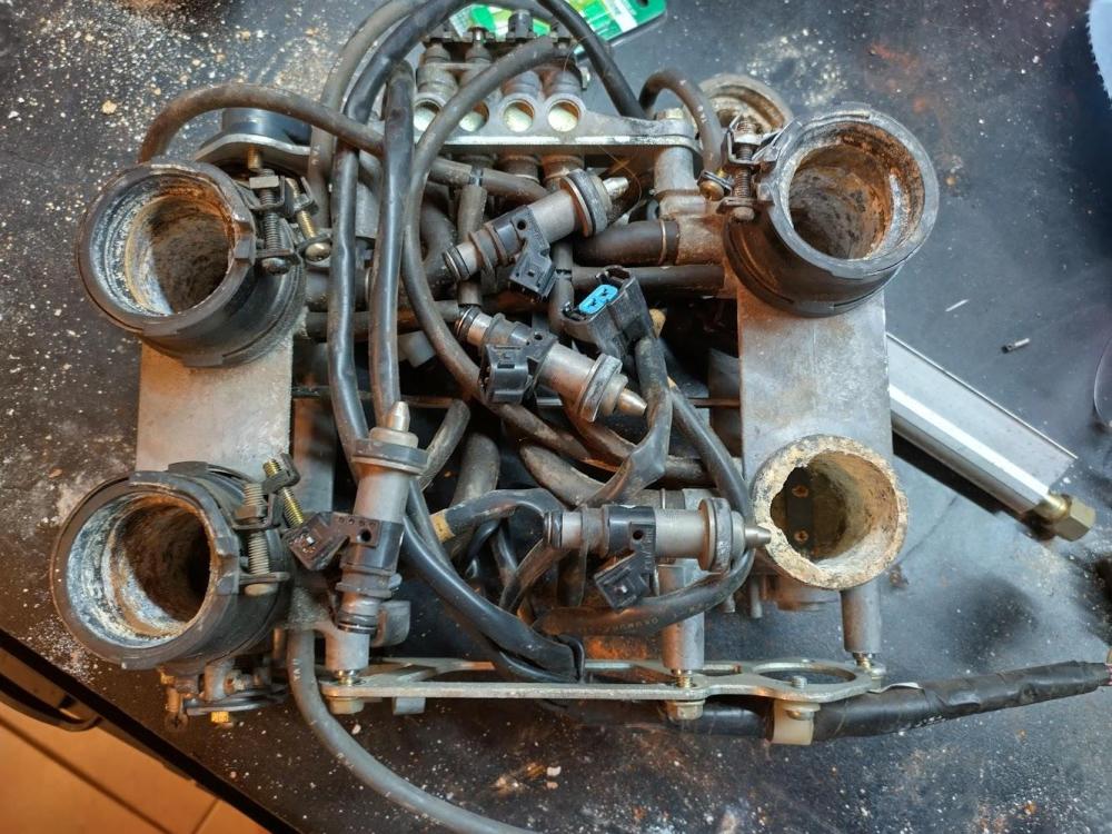 18. well the BCM thing didn't quite work out, but i got some very nice domino units instead. they were a bit cheaper than the other thing and still give me all the features i wanted, so it's all good. new MCs as well: new bars all set up: (was quite the relief to hook the switch blocks up and not blow any fuses or let any magic smoke out, all the buttons even work to boot including the ones that weren't there before) this digital flasher i've had laying around for like 8 years finally came in handy. chain and sprockets also on, swingarm's all back together: now some bad news. with the clutch SC back on, i decided it was finally time to start it. threw some fresh plugs at it, mashed the go button, it cranked, and...nothing. it did bark with some starter fluid, at which point it made oil pressure and showed no signs of leaks, but it wouldn't stay running. when i looked down the throttles, nothing was coming out the injectors. then i pulled off the return line and cycled the key to check fuel flow, which checked out just fine (which it damn well should, since i changed out almost the entire fuel system). so the injectors got gummed up. which means i gotta pull off the throttle bodies. son of a bitch. i think what i'm gonna do is pull the injectors out of the old motor and see if they'll come back to life, so i can just get the actual swap job all done in an afternoon, rather than having to leave the TBs on the bench for however long and worry about parts getting lost or junk finding its way into the good engine.