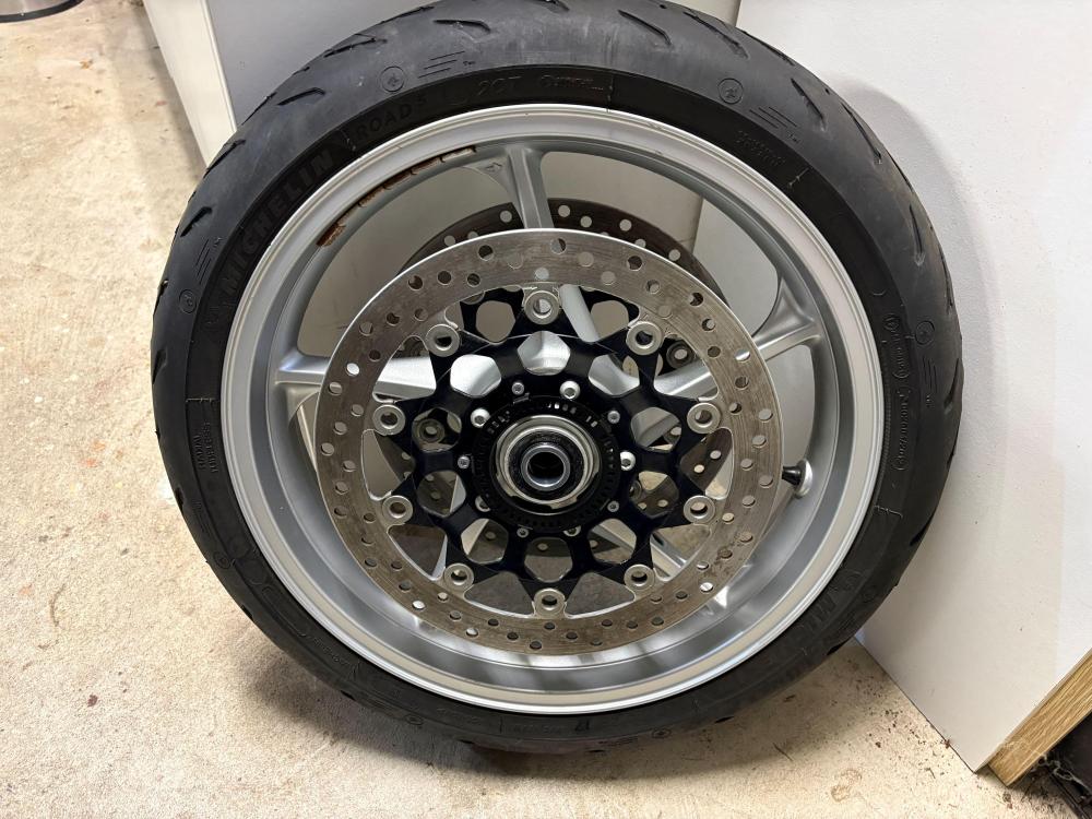 3. Back into it tonight as a few parts arrived from Japan and the Netherlands. Unfortunately I have learned (the expensive way) that my 2015 VFR is different in a few places to the earlier 1200. I got some used O2 sensor leads as I had a MIL indicating the 2-3 sensor was faulty, and I can see some crush marks on the cable where the radiator got bent back, so that made sense. Unfortunately, the 2015 (and I think the -X model) has the O2 sensor moved to under the rear of the motor, which means the lead is about 150mm longer, and the lead from the earlier one just won't fit. Looks like I will need another new part. I did at least confirm that plugging the new (short) lead in clears the MIL. I will see if a local autoelectrician can repair the damaged lead first. Also (and this one is harder to understand) the pair of levers ordered from Webike was lovely for the clutch, but no bueno on the brake, being both shallower but also the pivot point was slightly wrong. So I will just keep working with what I have, maybe add a screw into the area that contacts the stop switch so I can make that work. Anyway, I was at least able to rebuild my front wheel with some new bolts, cleaned up rim and repainted ABS ring.