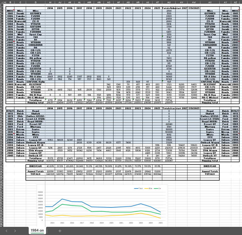 19. I saw this post and said to myself "I don't know" So I went through my stuff/records. For many years in my youth I did not own a car, which meant I racked up lots of miles on my bike(s) Got my MC license in 1976, the miles listed are what I put on the bike myself, A star (*) next to the bike means I took it cross country from New England to Calf. and as far north as Prince George in British Colombia. Here Go's 1976 Honda CB400F - new 41,550 1978 Honda CX500 * -new 51,100 1985 Honda VF700S - 12,600 1977 Honda CB550F - 980 1985 Honda VF1100S * -26,800 1985 Honda VF1000R * - 14, 250 1985 Honda VF1000R - 3,150 1985 Honda CB650C * -7,800 1983 Honda VF750F - 5,900 1987 Honda VFR700F - 5,218 1997 Honda VFR750F - 74,620 1983 Kawasaki GPz1100 - 3,770 1991 Honda VFR750F (UK) - 6,850 2016 Honda Africa Twin - 800 1990 Honda VFR750F - 620 1986 Honda VFR750F - 0 2001 Honda VFR800F - 11, 505 So, 17 bikes and 267, 513 miles to date for bikes I own(ed). No pics of my early bikes unless I can find my analog photos, will put a few Random pics I have on my computer of a few others. Had to edit this twice, forgot I owned a 2016 Africa Twin, and an 87 VFR700.