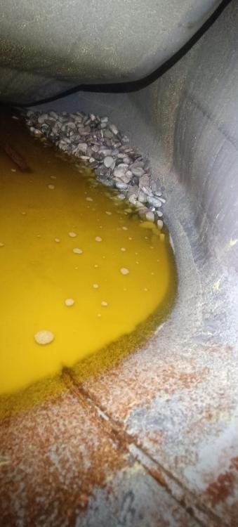 17. I haven't disappeared; I have a bit of time to devote to these things, so the wait is a bit long. During my "vacation" in August, I dedicated myself to cleaning the rusty tank with Beyond Ballistics' "magic potion," and the result was amazing. I wasn't entirely convinced, especially since the treatment leaves a dark patina on the metal, which is easily removed by scrubbing, but doing it inside the tank and reaching all the spots was impossible. So when I did the treatment, I added some gravel (6-7 lbs) to scrub the inside of the tank. I'm posting some photos of the same parts before and after the treatment so you can judge the result for yourself. during treatment Once finished I rinsed several times with water shaking the gravel inside, then once everything was removed I put in a little diesel to remove the water residue and leave everything slightly greasy so that it doesn't rust.