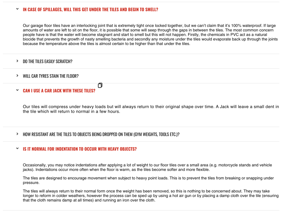 13. Wouldn't it all come down to the load/area? Seems hard to believe that a company selling garage flooring wouldn't have taken into account the wear & tear of jacks and rolling cabinets full of tools. They list a Hardness = 89-92 Shore A, but not a more understandable load rating. Otoh, their faq says this: